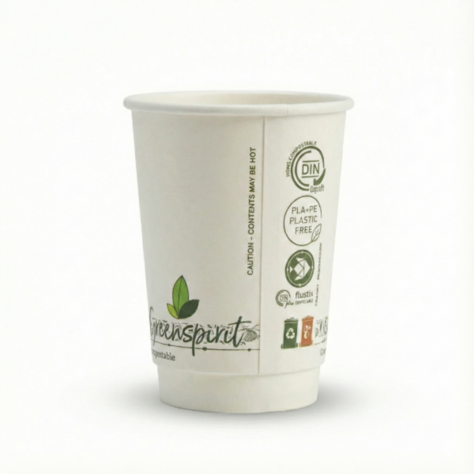 The 10oz White Greenspirit Aqueous DW Hot Cups are ideal for enjoying a variety of hot beverages. This pack includes 20 sets of cups, with each set containing 25 cups. The cups are made with a double-wall construction, providing insulation and ensuring that the exterior remains cool to the touch. They are a convenient choice for coffee shops and takeaway services. As the name may suggest, aqueous coating is water-based and breaks down harmlessly without any specialist treatments required. These cups are far more likely to end up being recycled as they don’t need any special facilities or treatments to recycle. They are also both industrial and home compostable. Certified - Din Home Compostable Certified - Flustix Recyclable Certified - PAP 21 coffee cup, disposable coffee cup, tea cup, hot chocolate cup, late, cappuccino, frappe, soft ice-cream, ice coffee