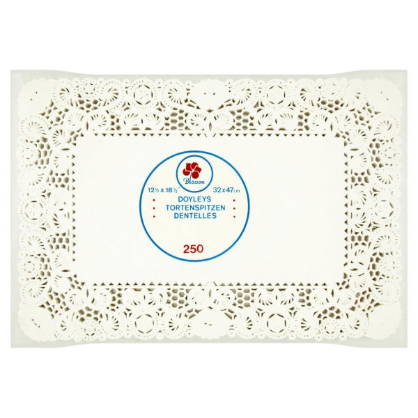 Create a refined table setting with these 12.5"x18" White rectangular doylies. This case includes 4 boxes of 250 doylies each. They are perfect for use under large platters, trays, or as decorative accents, elevating the visual appeal of your dining occasions. 176363, 643031, Sysco tray paper