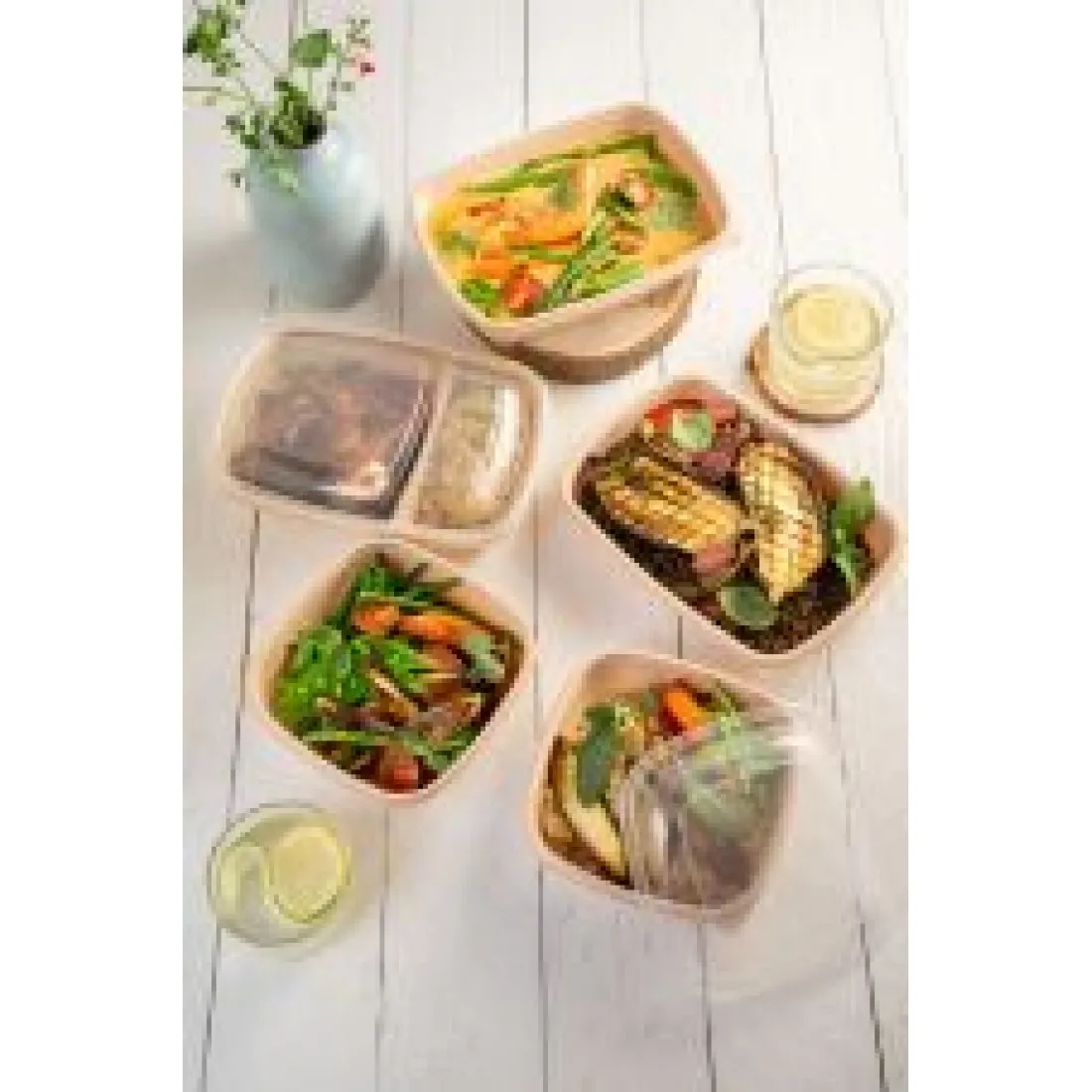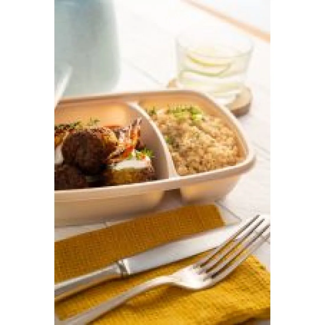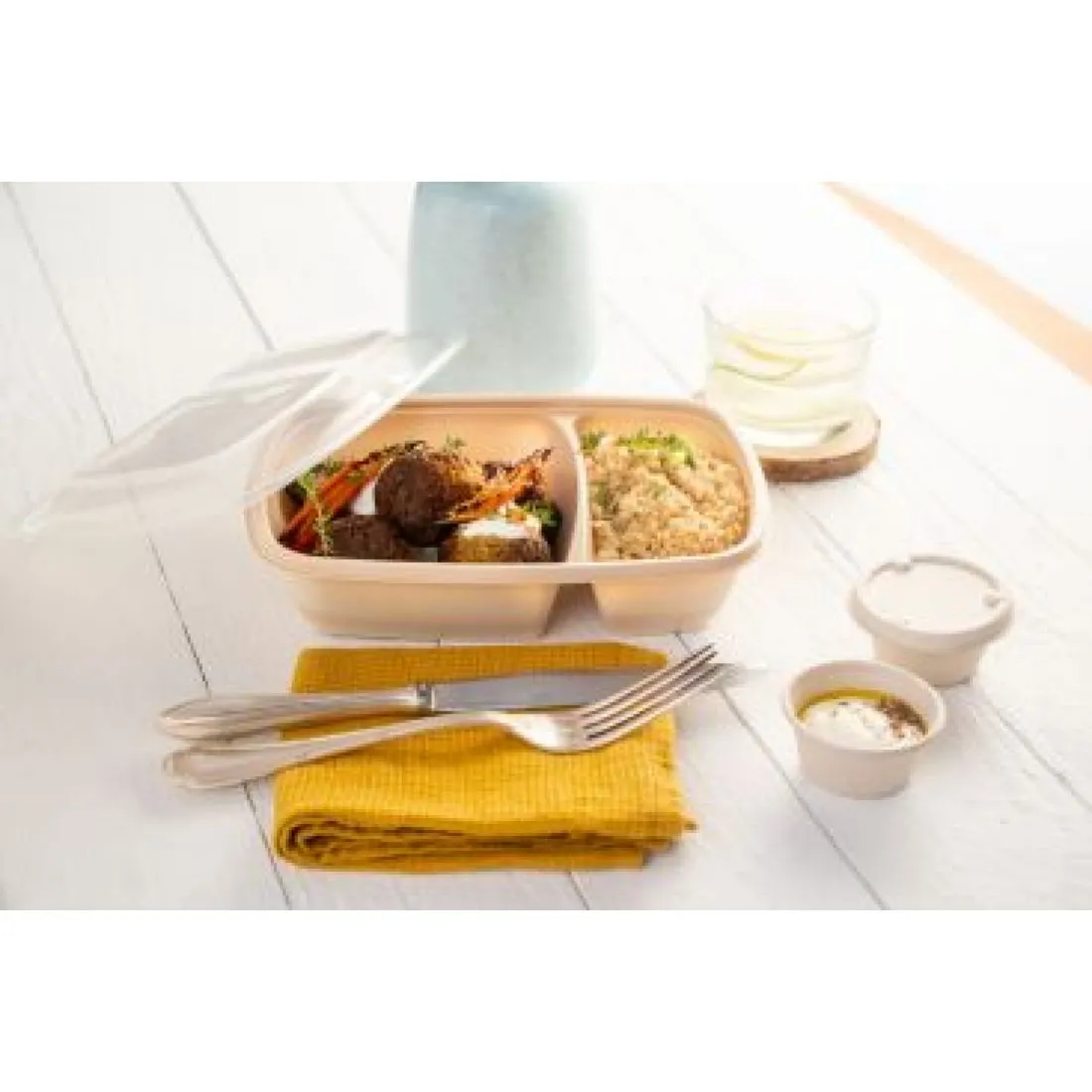 This 600ml & 300ml two compartment mocha container is perfect for serving a variety of meals with sides. Matching two part lid (23500129) is suitable for reheating food in the microwave. Recyclable and sustainably designed to minimize plastic use.