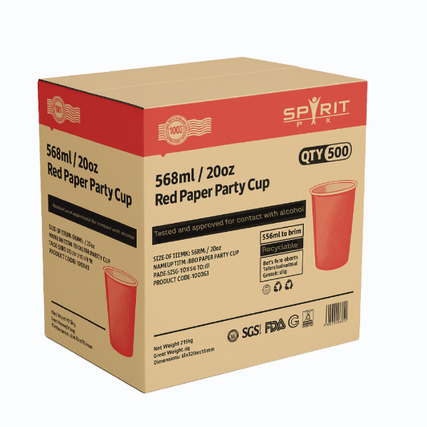 The SpiritPak Red Paper Party Cup is a practical and sustainable option for serving pints at events, pubs, and outdoor venues. With a 568ml to brim capacity, it provides the same functionality as a standard pint cup while using 86% less plastic than traditional plastic pint cups. These cups have been alcohol migration tested, ensuring it is safe for use with alcoholic drinks. The sturdy paper material makes it reliable for busy service, while the red finish offers a clean, professional look suitable for a variety of occasions. Our cups come packaged conveniently in 20 sleeves of 25 cups (500 cups per case). Key Benefits: 568ml to brim capacity – perfect for beer, cider, and soft drinks 86% less plastic than standard plastic pint cups – eco-friendly and compliant with sustainability goals Alcohol migration tested – safe and approved for alcoholic beverages Durable and reliable – suitable for busy events and high-volume service Vibrant red design – enhances presentation and brand appeal A straightforward, lower-plastic alternative for high-volume service.