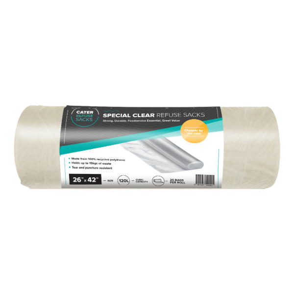 The 26" x 42" Special Clear Refuse Sacks (8x25's) are robust, large-capacity bags designed for specific waste disposal needs. These clear refuse sacks provide visibility of contents while offering durability for commercial and industrial use. The bulk pack of 200 sacks ensures a consistent and ample supply for managing substantial amounts of waste. 751325, BWG, Sysco
