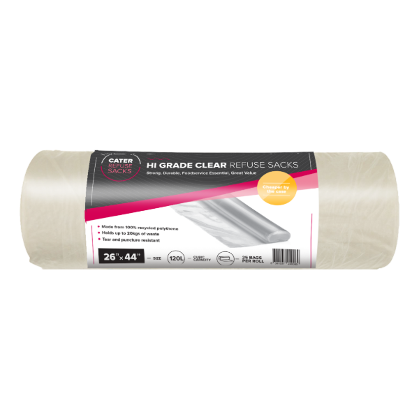 The 26" x 44" Hi-Grade Clear Refuse Sacks (8x25) offer exceptional strength and durability for tough waste disposal tasks. These high-quality clear garbage bags provide visibility of contents while handling heavy loads efficiently. Ideal for commercial and industrial use. Each pack includes 8 rolls, with 25 sacks in each roll.