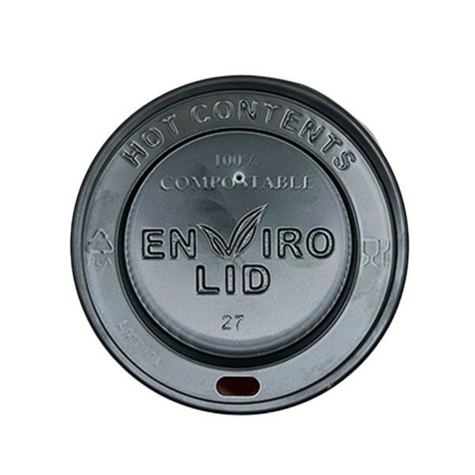 High-quality 90mm black compostable hot cup lids for 12oz and 16oz cups, available in bulk (10x100). These eco-friendly lids are perfect for businesses looking to reduce their environmental impact. They offer a secure fit and a sleek, professional look, making them ideal for sustainable coffee shops and cafes serving hot beverages. Musgrave, 711872, Sysco