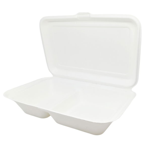 The 9"x 6 x 2" - 2 Comp Bagasse Meal Box is a compartmentalised food container made from bagasse material. Made from bagasse, a natural and renewable material derived from sugarcane pulp, this meal box offers an eco-friendly alternative to traditional plastic or foam containers. The generous capacity of 1000ml makes it suitable for serving various meals, including rice, noodles, pasta, salads, or other takeaway options. The sturdy and leak-resistant construction of the bagasse material ensures that your food remains secure and prevents any unwanted spills or leaks. Each pack contains 5 sleeves, with 50 meal boxes in each sleeve. Each compartment has a capacity of 1000ml. 447398, 669884, Sysco salad container, curry box, spice box, noodle meal, rice meal, tex mex, asian food, wraps, chips