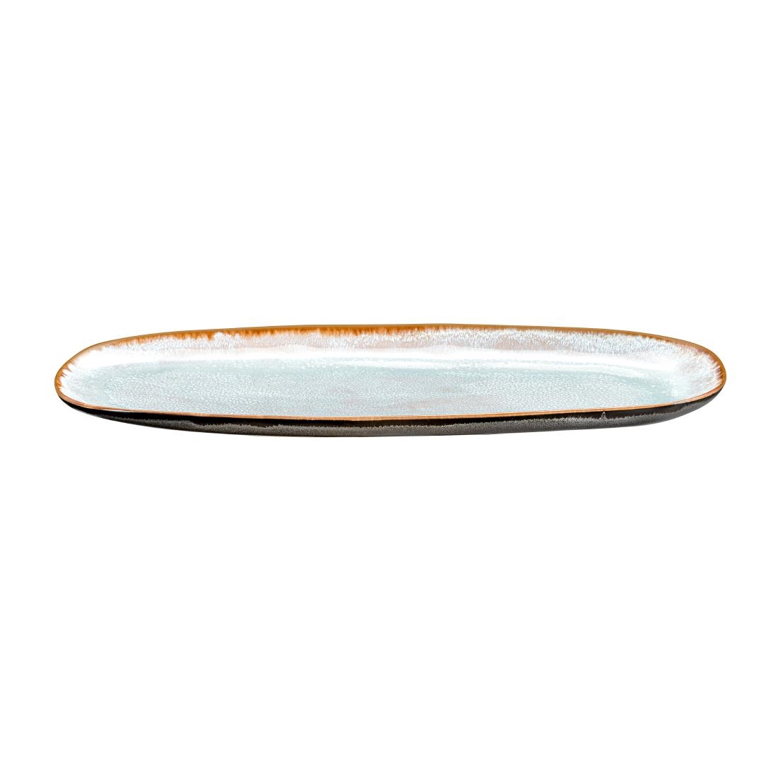 Part of the Medard De Noblat Shadow Aqua collection, these 355x140mm stoneware platters feature a stunning reactive glaze and an organic off-round shape that makes every piece unique. An aqua-toned interior contrasts beautifully with a textured anthracite exterior, accented by a warm golden-brown rim.
