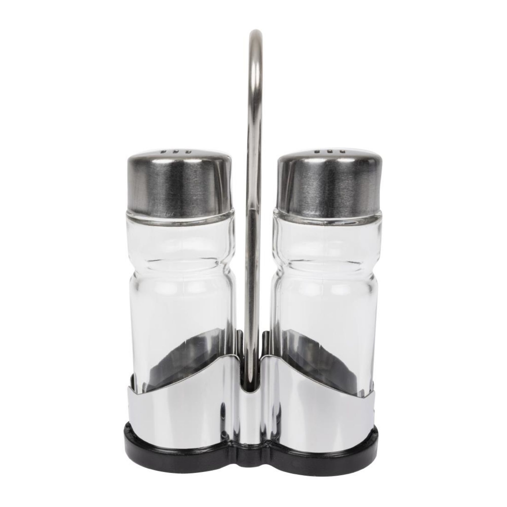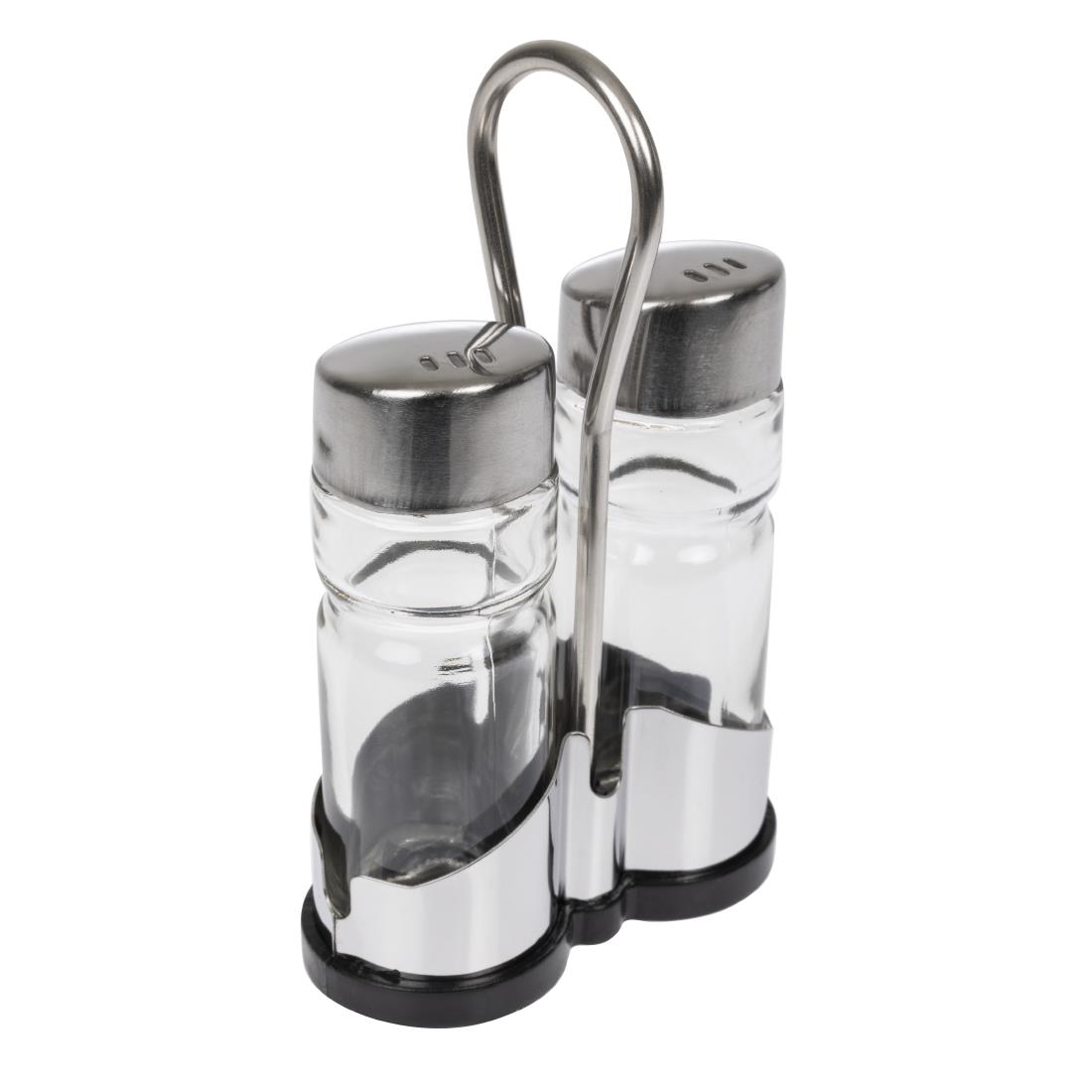 The product features a stainless steel holder with a black plastic base, complemented by glass salt and pepper cruets that come with stainless steel lids. Spare cruets are available for purchase separately.