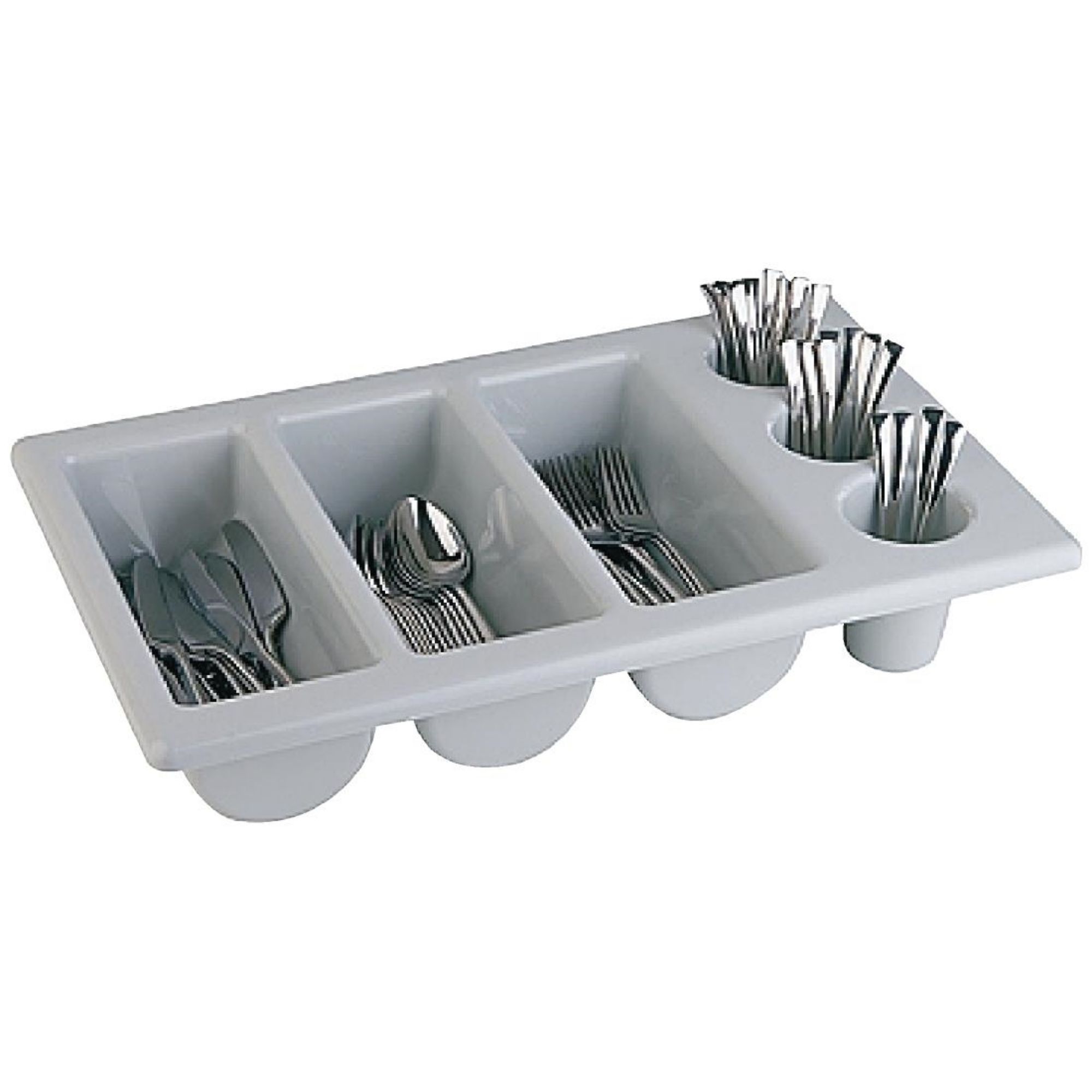 The plastic cutlery dispenser features six compartments and is designed to be stackable for convenient storage. It is also dishwasher safe, ensuring easy cleaning and maintenance.