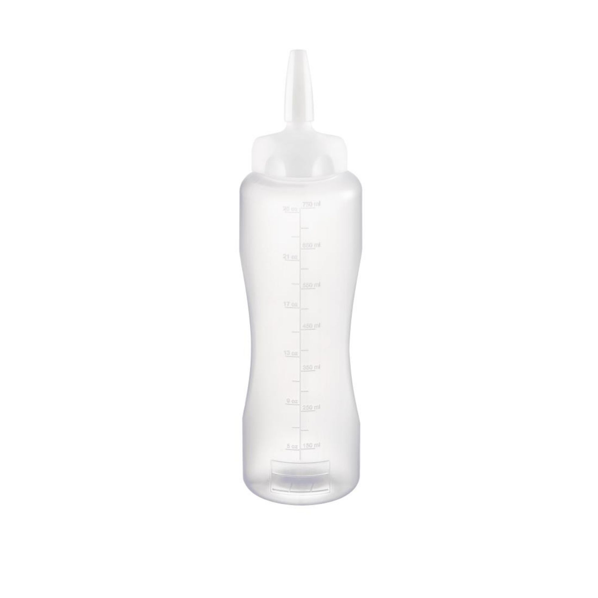 Improve your presentation with the Araven 750ml clear sauce bottle. Designed with a continuous line nozzle, the bottle helps you apply precise doses of sauce to create impeccably arranged dishes. The nozzle can also be cut to achieve different thicknesses, giving you more control over your presentation. Microwave safe, the bottle can store hot and cold sauces, providing you with more choices when it comes to presenting your meals. Finished with ml and oz measurements, the bottle also helps you control your portions effectively. It has a working temperature range from -40°C to 90°C and includes measuring scales in ml/oz.