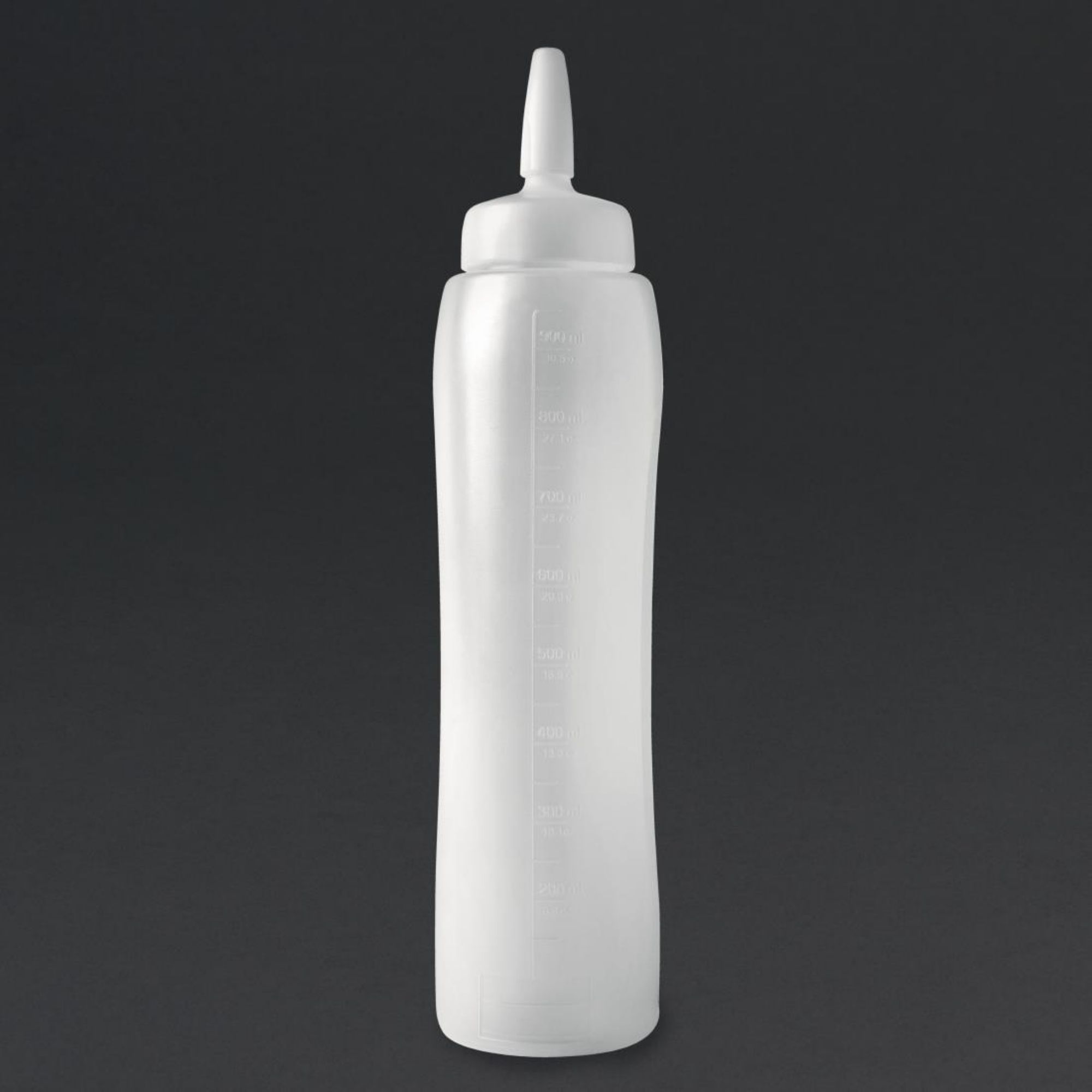Improve your presentation with the Araven 1 litre clear sauce bottle. Designed with a continuous line nozzle, the bottle helps you apply precise doses of sauce to create impeccably arranged dishes. The nozzle can also be cut to achieve different thicknesses, giving you more control over your presentation. Microwave safe, the bottle can store both hot and cold sauces, providing you with more options when it comes to presenting your meals.
