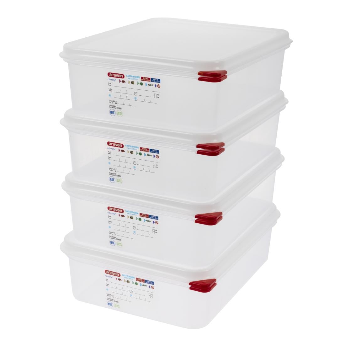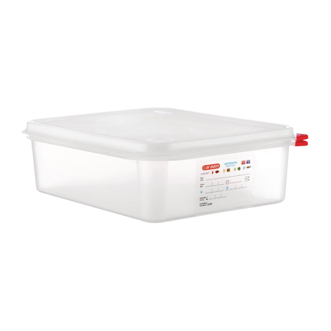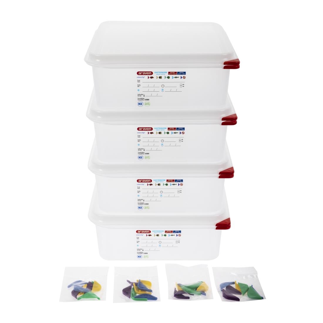 The airtight gastronorm-sized container comes with a lid and is designed for optimal food storage. Each container is equipped with a set of color-coding clips in red, yellow, green, and blue, along with a permanent wipe-clean label. This feature allows for easy identification of contents and simplifies food rotation. With a temperature range of -40°C to 95°C, these containers are ideal for use in any kitchen environment. Additionally, they are dishwasher-proof, ensuring easy cleaning and maintenance.