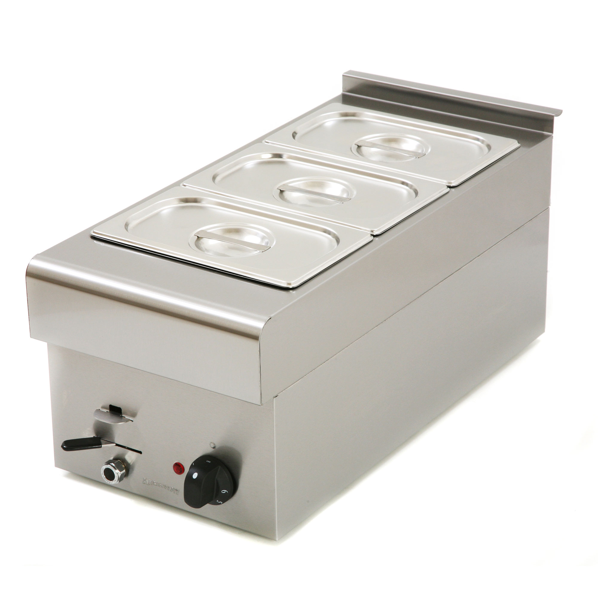 The Archway countertop gastronorm bains marie is an electric three-pot bain marie designed for precise temperature control. This product is ideal for buffet-style dining and various catering applications. It features a stainless steel body, ensuring maximum hygiene and convenience. The temperature range of this bain marie is between 30 to 90 degrees Celsius, making it suitable for all types of food preparation. It is perfect for keeping sauces, soups, gravies, and other dishes hot and ready to serve.