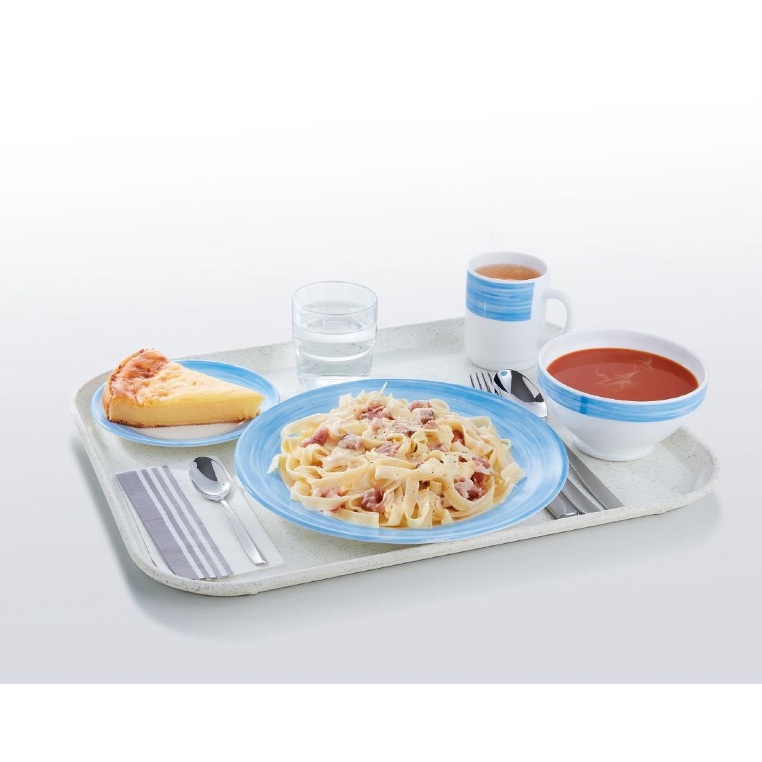 Arcoroc Brush plates stand out with their distinctive design, featuring broad coloured "brush strokes" around the rim that contrast with the white surface of the plate. This use of colour is especially practical in healthcare environments, where it can help with food zoning or identifying different dietary requirements.
