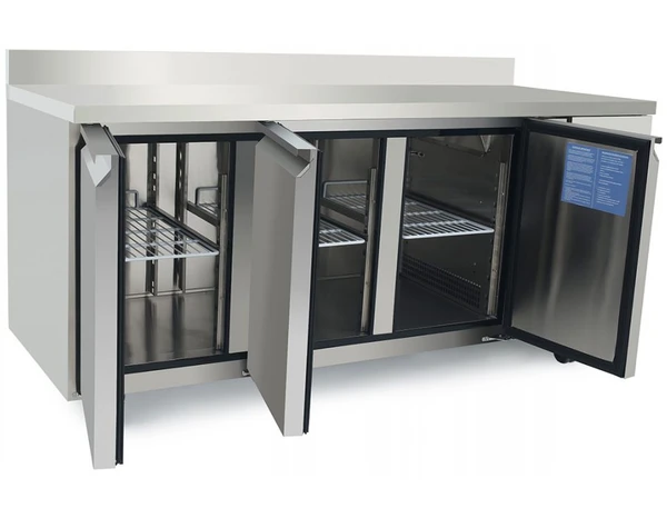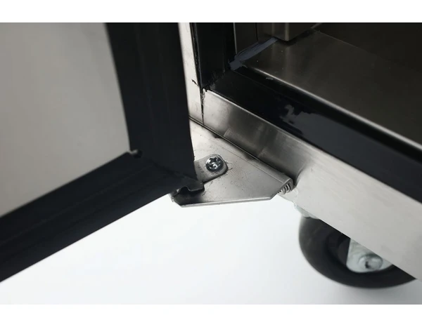 The Atosa EPF3432HD Three Door Table Fridge is constructed with a high-grade stainless steel exterior and interior. It is equipped with a heavy-duty Embraco compressor.
