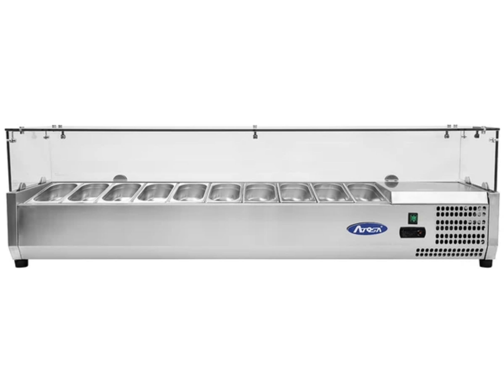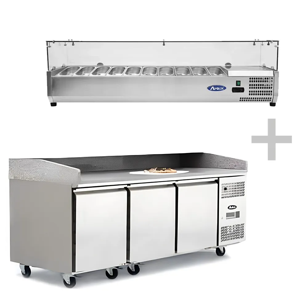 The Atosa EPF3485GR + VRX2000/330 3 Door Pizza Counter Fridge is part of Atosa's green range. It offers improved energy efficiency and lower running costs while maintaining performance in environments with ambient temperatures of up to 43°C. This product includes the VRX Countertop Topping Unit, as shown in images. The fridge can also be purchased separately without the VRX Countertop Topping Unit as model EPF3485GR.