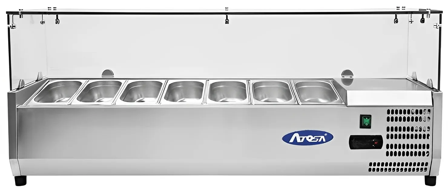 The Atosa EPF3495GR + VRX1500/330 2 Door Granite Top Pizza Counter Fridge with VRX Unit and GN Pans is part of Atosa's green range. It offers improved energy efficiency and lower running costs while maintaining performance in environments with ambient temperatures of up to 43°C. The fridge features self-closing and stay-open doors, along with castors, making it user-friendly. The marble top is ideal for pizza dough preparation, and the VRX (topping well) provides the convenience of easily accessible refrigerated storage for salads and toppings.