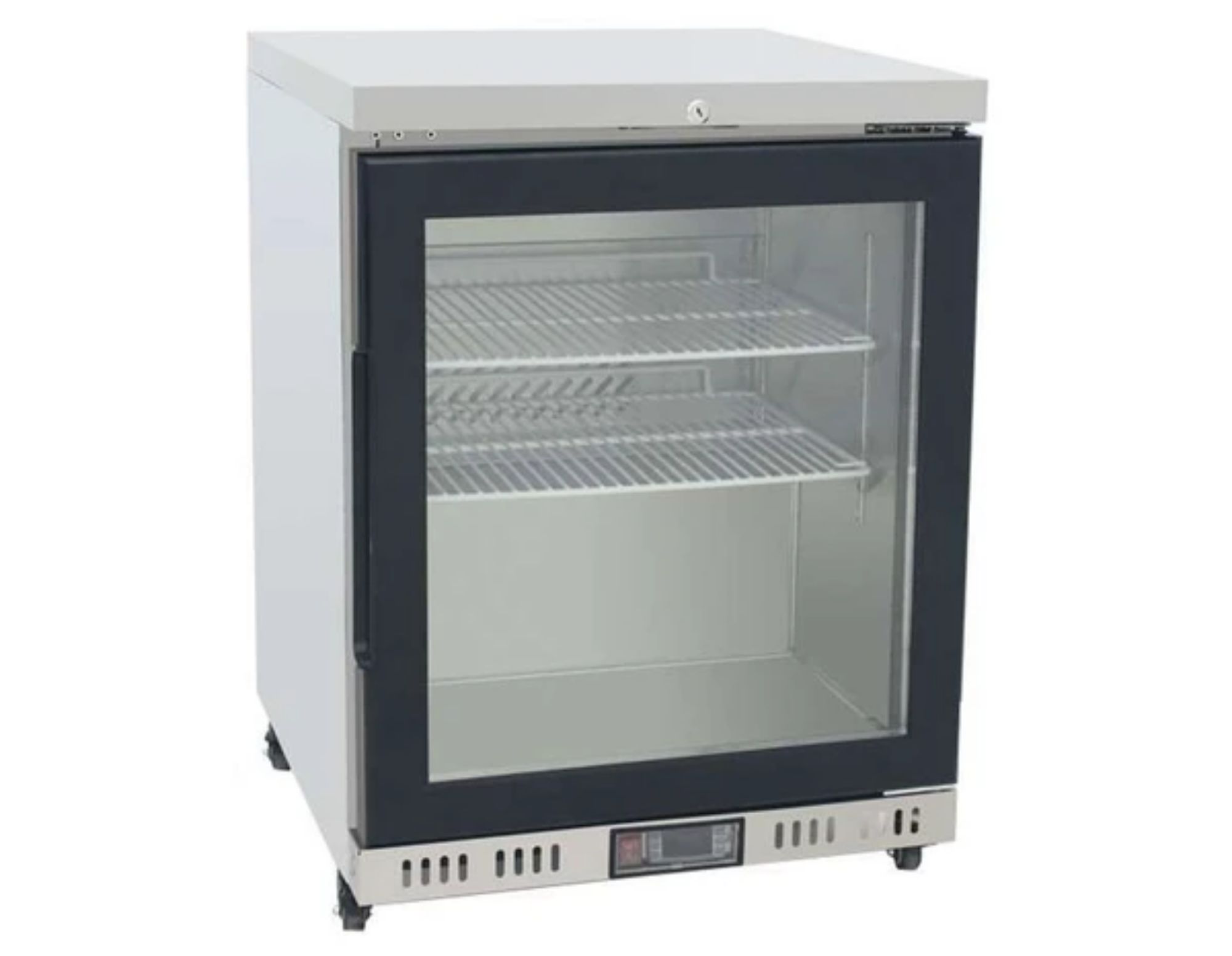 The Atosa MBC24G Single Glass Door Undercounter Cabinet Fridge, featuring fan cooling and a digital controller, is a compact undercounter fridge. With two adjustable shelves, the MBC24FG offers all the features needed for a professional kitchen.