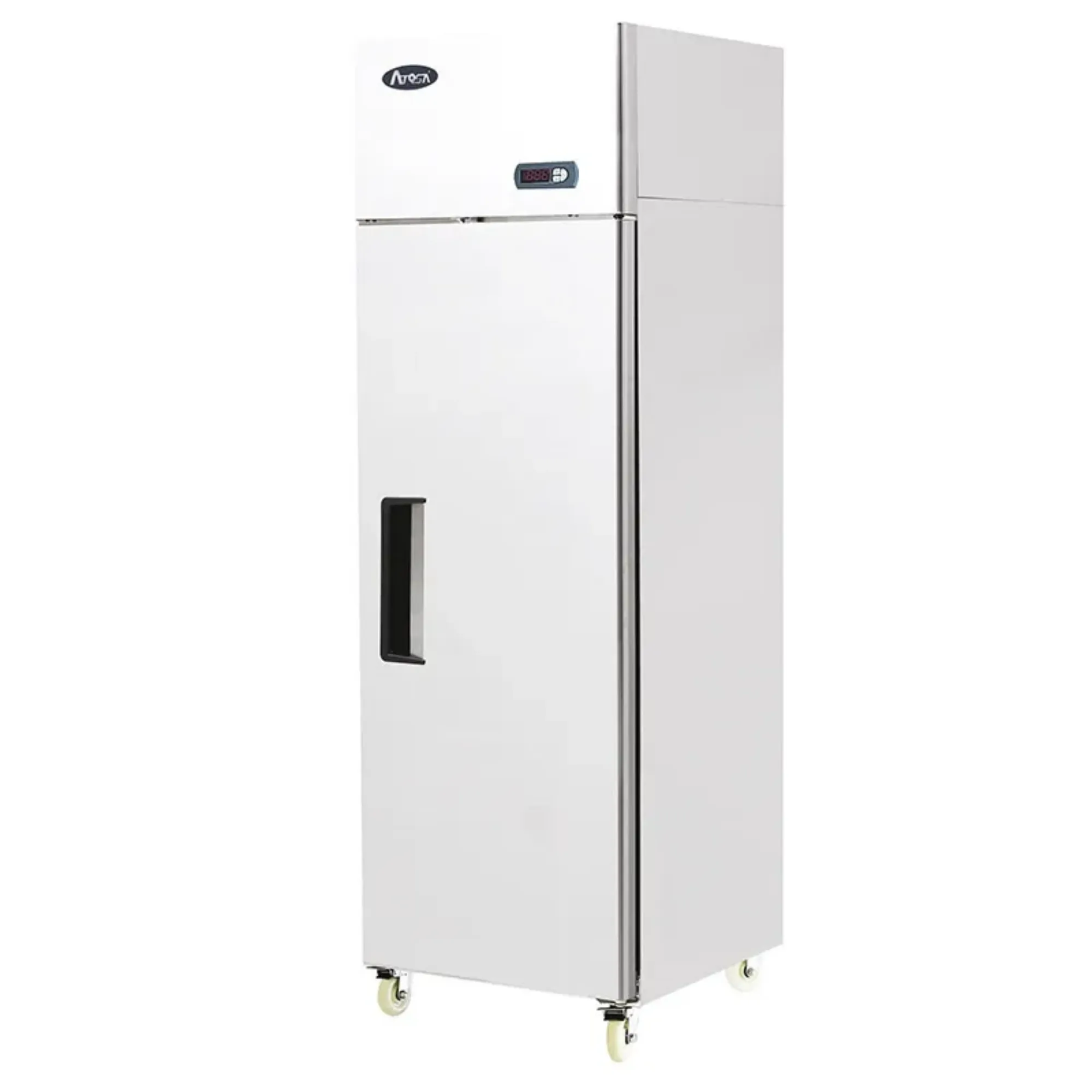 The Atosa stainless steel freezer boasts a 440-litre capacity. The Atosa YBF9207GR Slimline Upright Single Door Freezer is constructed with high-grade stainless steel on both the exterior and interior. It is equipped with a heavy-duty Embraco compressor, ensuring reliable performance and durability.
