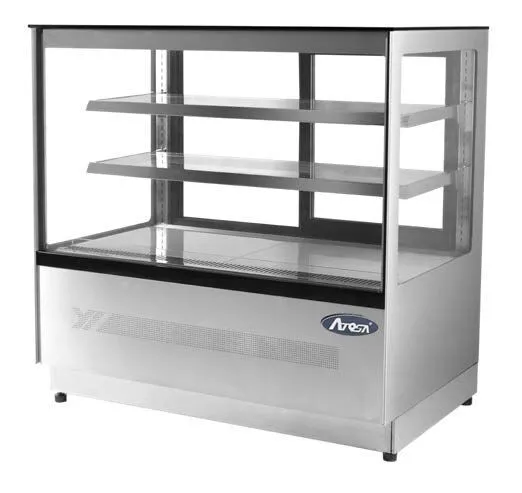 The Atosa WDF097F Heavy Duty Squared Glass Deli Counter is constructed with high-grade stainless steel for both its exterior and interior, featuring a mirror finish inside. It is equipped with energy-saving white LED lighting under each shelf to enhance product presentation.