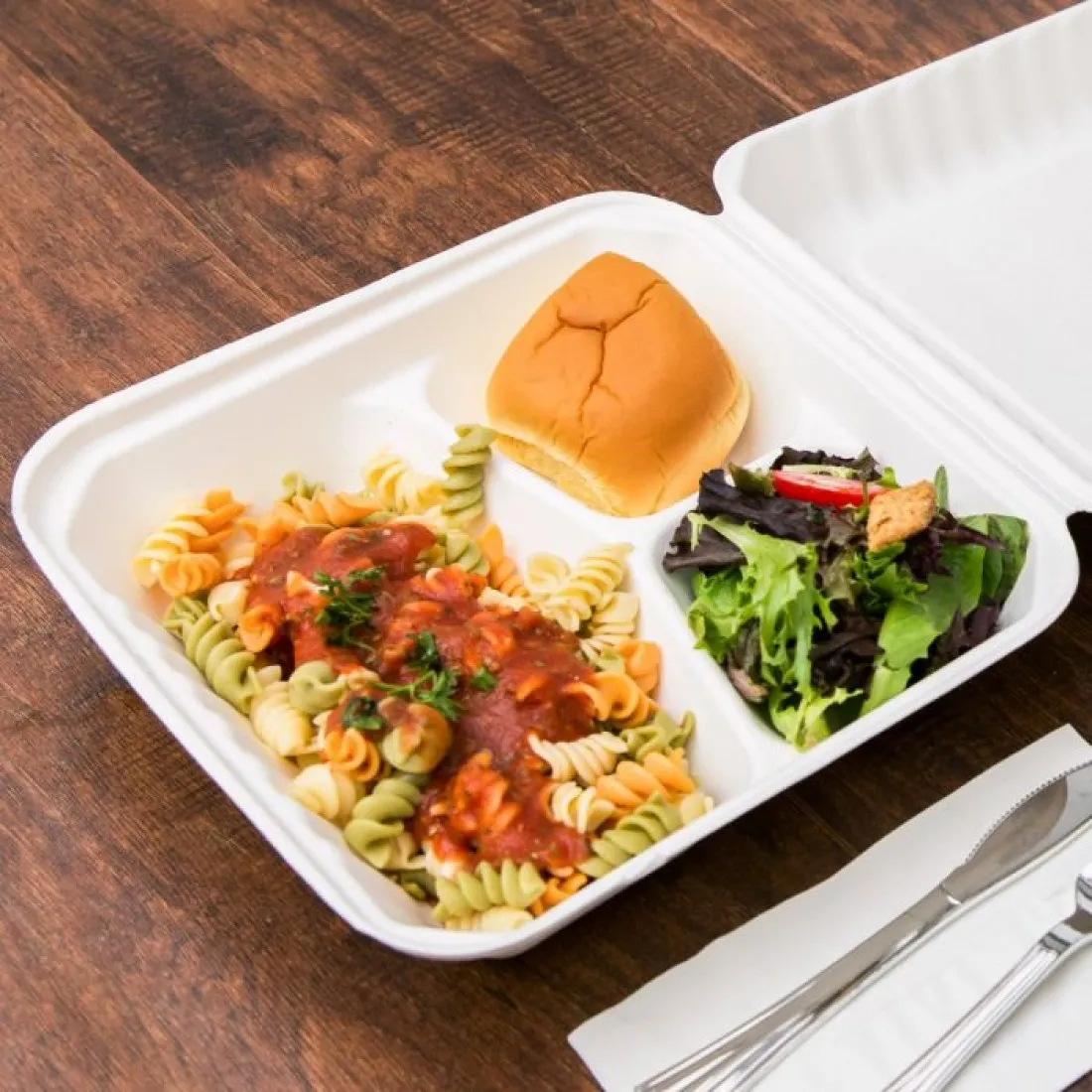Biodegradable 3 compartment meal box retain heat and ensure the integrity of their contents. Made from sugarcane pulp, the Bagasse range is 100% biodegradable and compostable. They compost in 30-60 days. Microwavable up to 110 celsius for 2 minutes.