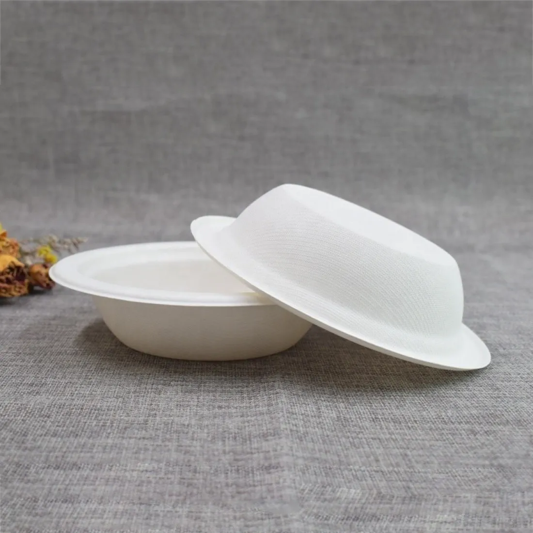 Biodegradable Bagasse 32oz bowls. Made from sugarcane pulp, the Bagasse range is 100% biodegradable and compostable. They compost in 30-60 days. Microwavable up to 110C degrees for 2 minutes.