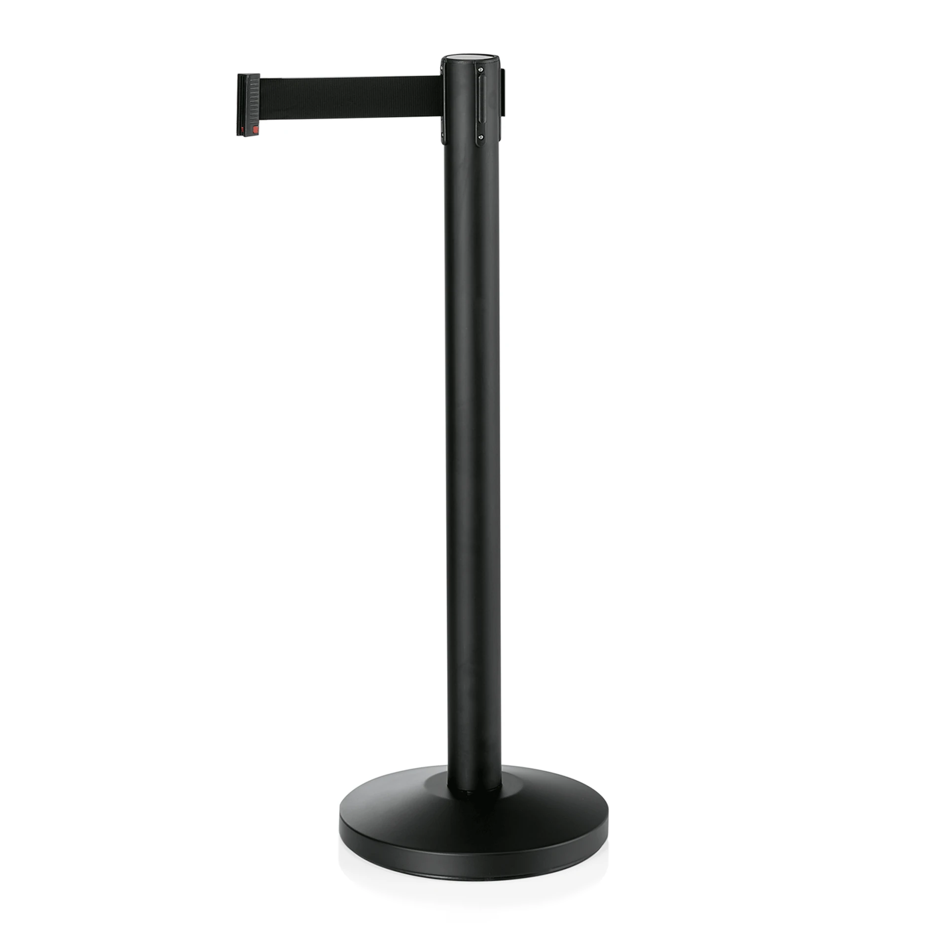 The product features belt connections with a 4-way system and includes a belt strap that is 2 meters long. The belt strap is integrated into the design, providing convenience and ease of use. The item weighs 6 kg and stands at a height of 90 cm. It has a post with a diameter of 10 cm and a circular base plate with a diameter of 32 cm. The product is powder-coated in black, ensuring durability and a sleek appearance.