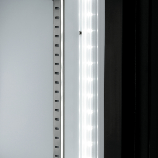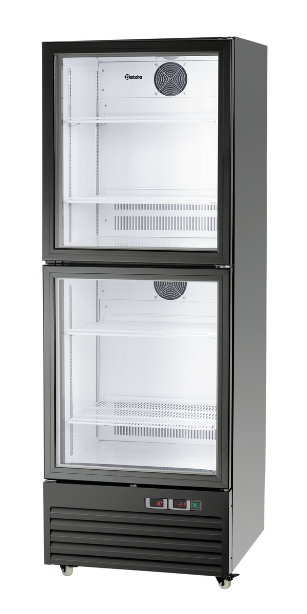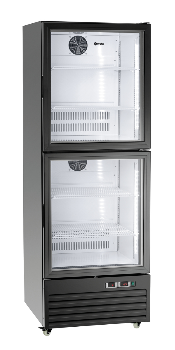 - Properties: 4 swivel casters, 2 with brake, LED lighting, separately switchable, Fridge at top | Freezer at bottom
