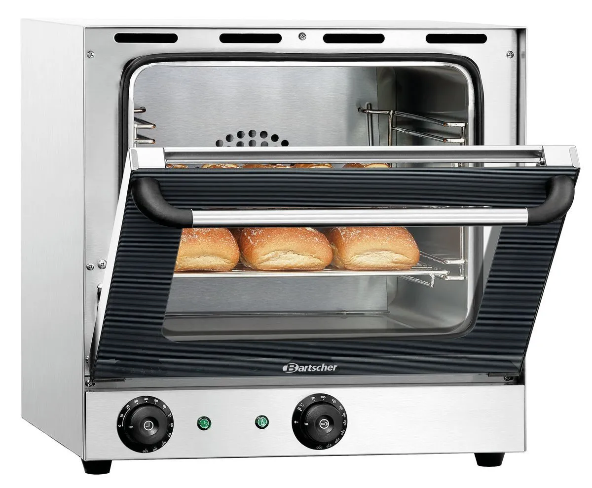 - Properties: Double-winged door pane, Rounded baking chamber, Bearing rails can be detached, Signal tone after expiry of the time