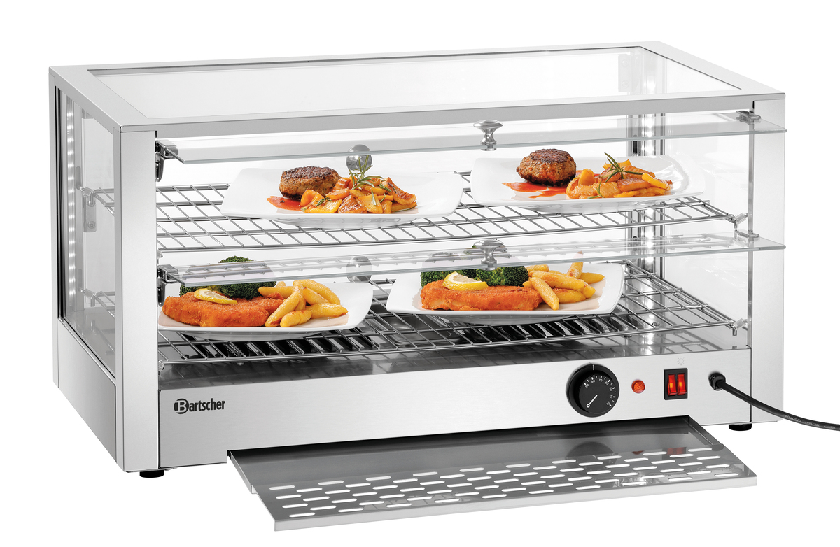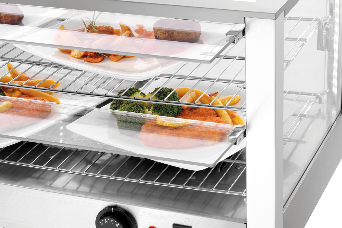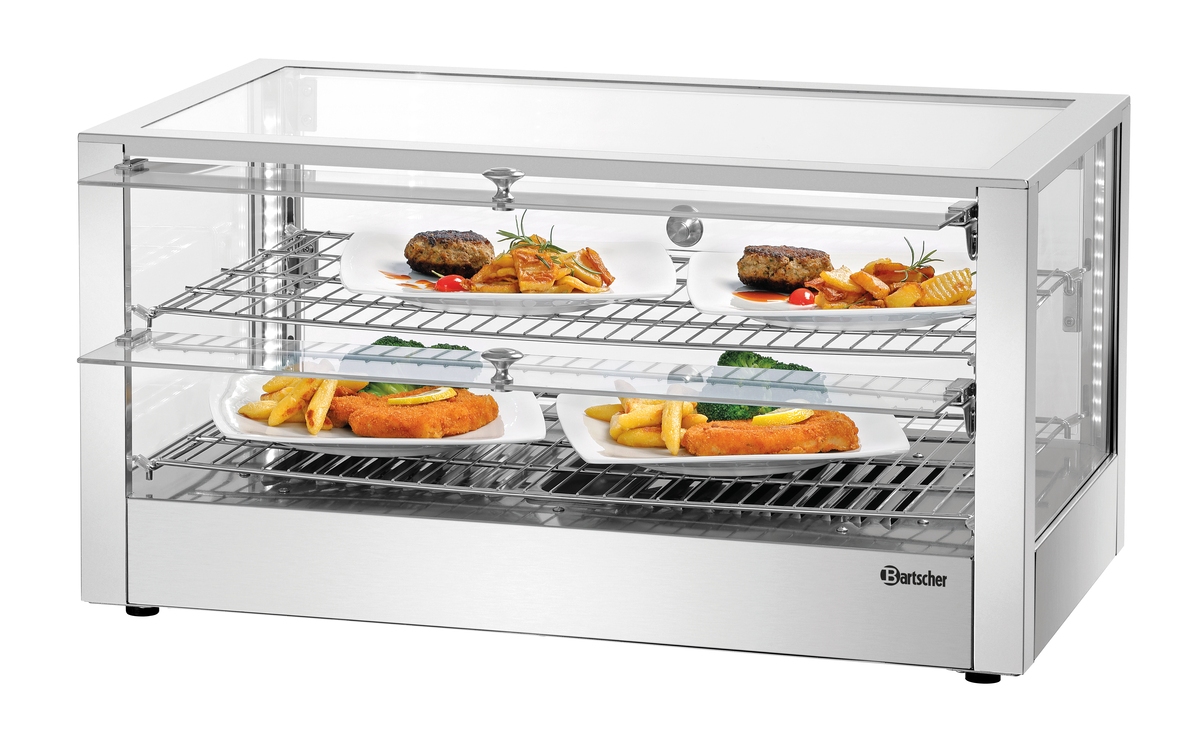 Table top unit that can be operated from both sides by means of practical lifting doors and LED lighting.