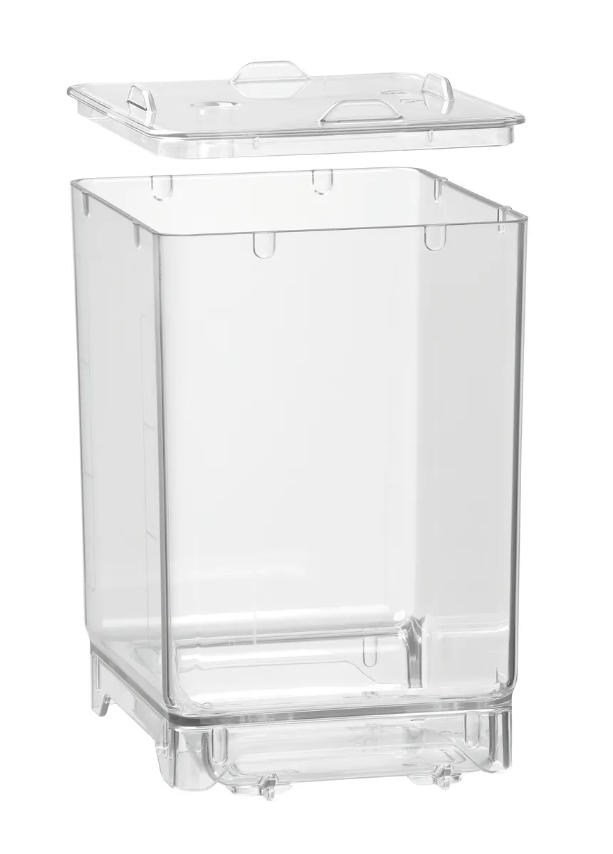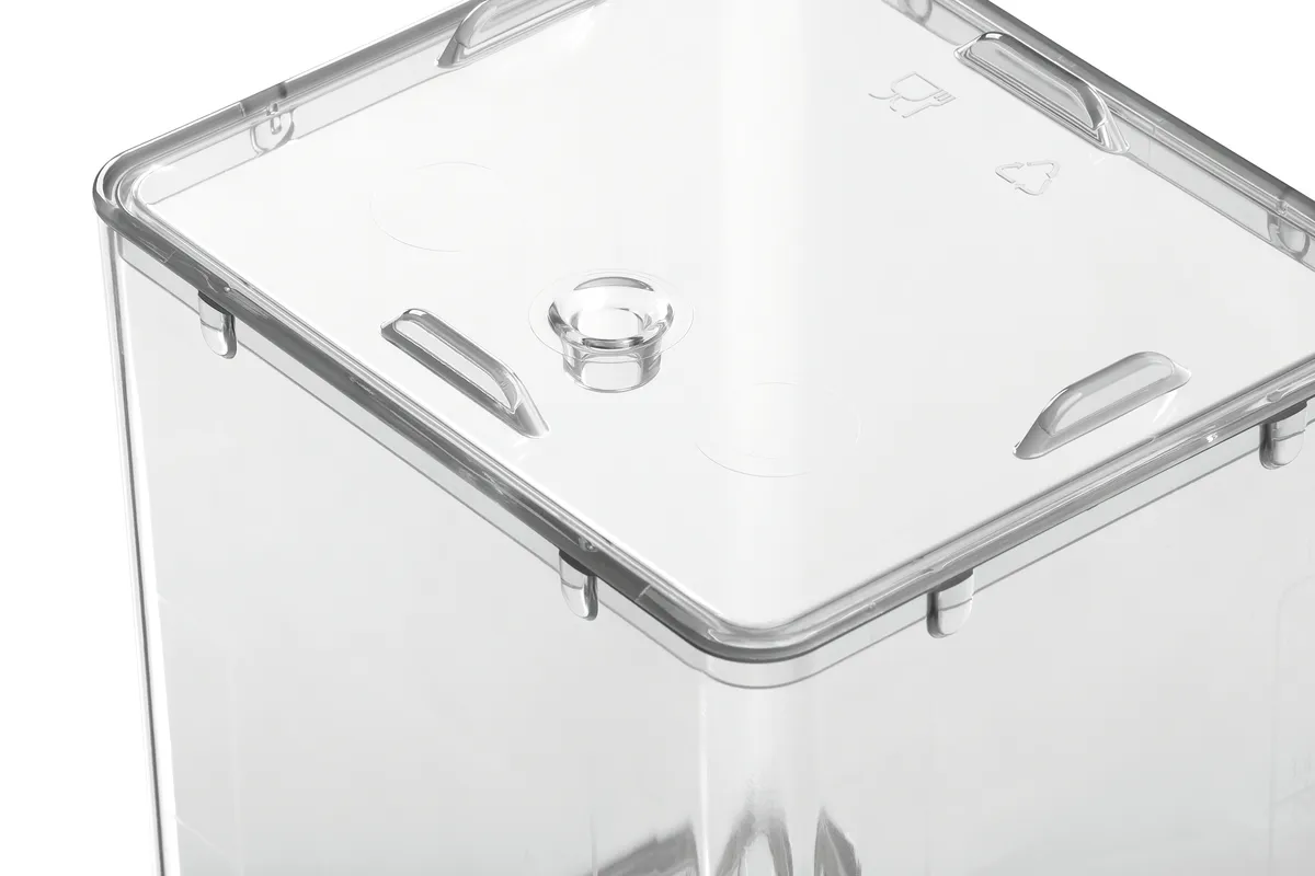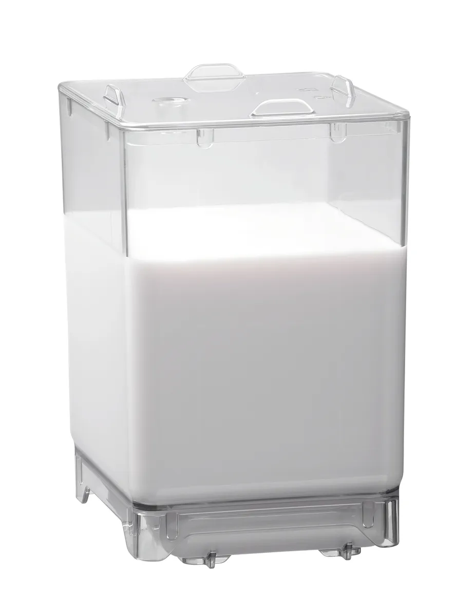 The milk container, capable of holding up to 4.5 litres of milk or accommodating milk bags, is the perfect addition to the KV8.1L milk refrigerator. It ensures that chilled milk for cappuccino, white coffee, latte macchiato, and more is drawn directly from the container through the opening in the lid.