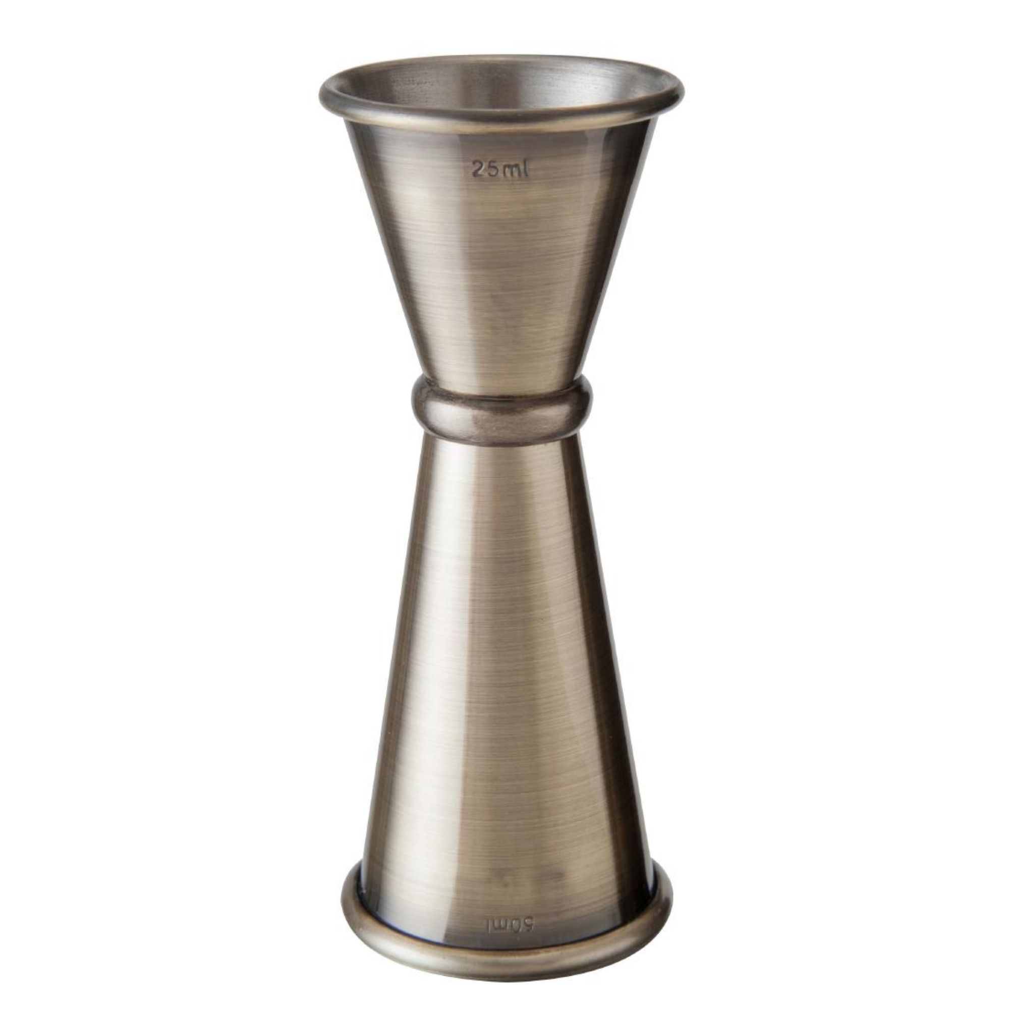 The antique brass range offers an opulent style that delivers a unique aesthetic. This banded jigger includes both 25 ml and 50 ml cups and features internal markings for 35 ml pours.