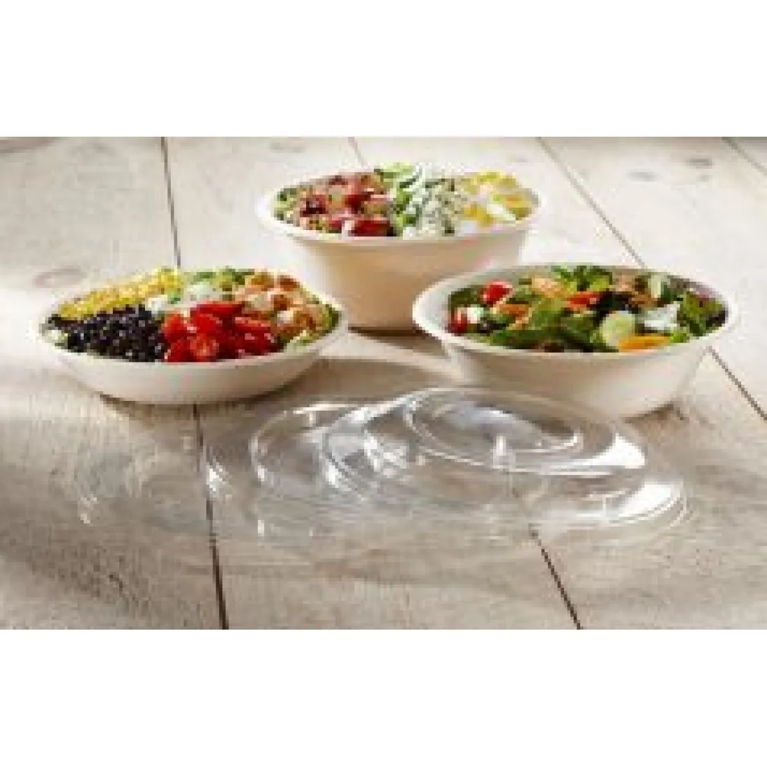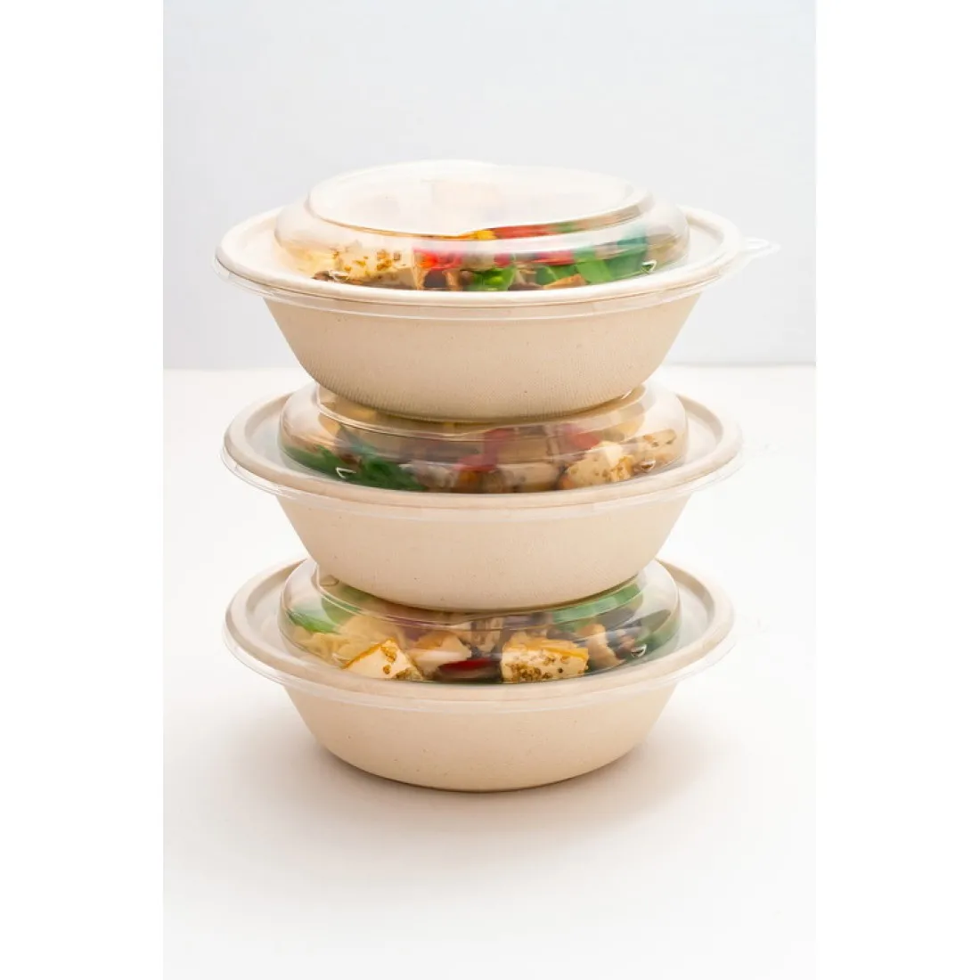 This large round compostable bowl is a simple solution for takeaway meals and salads popular with delicatessens. Pair with other bowl sizes for a full menu & portion range. Made from moulded fiber pulp. Tight fitting lids protect against spills (23500005).
