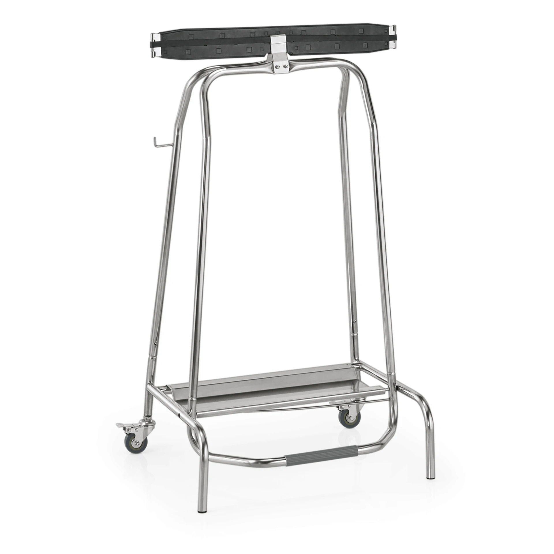 The product features a foot pedal and two castors with a brake for easy mobility and secure placement. The bin liner is securely closed with a rubber holder. Please note that the delivery does not include a bin liner.