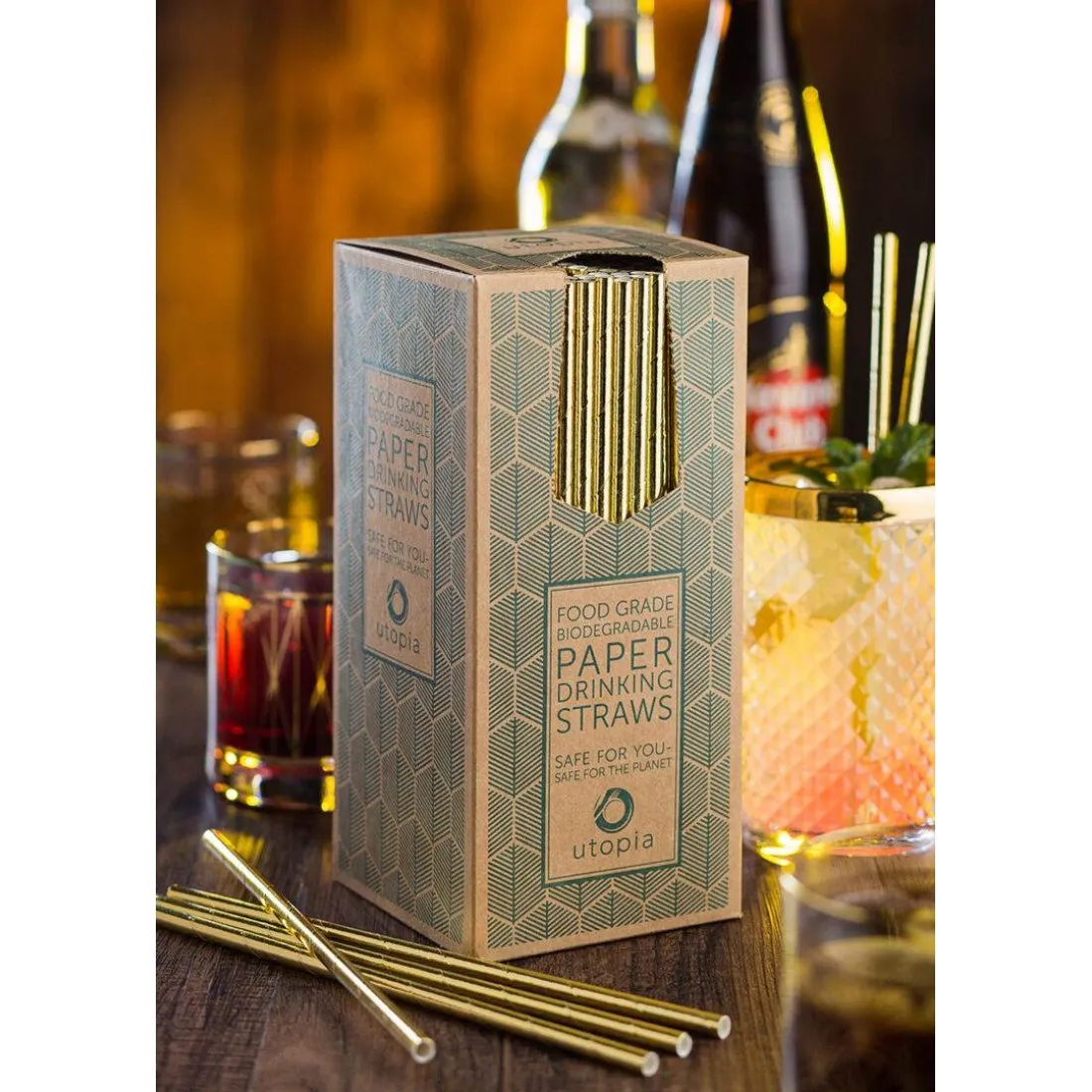 These gold paper straws boast a stunning colourway, making them an exciting complement for gold barware and cocktail equipment. These single-use disposable straws are therefore a visually pleasing way to help your business move away from plastic straws. With silver and copper straws also available, it's easy to customise individual cocktails or milkshakes and make them look really special. The paper material makes these straws 100% biodegradable and 100% recyclable. This will help you to reduce your business's environmental impact and meet consumer demand for eco-friendly alternatives to single-use plastic.