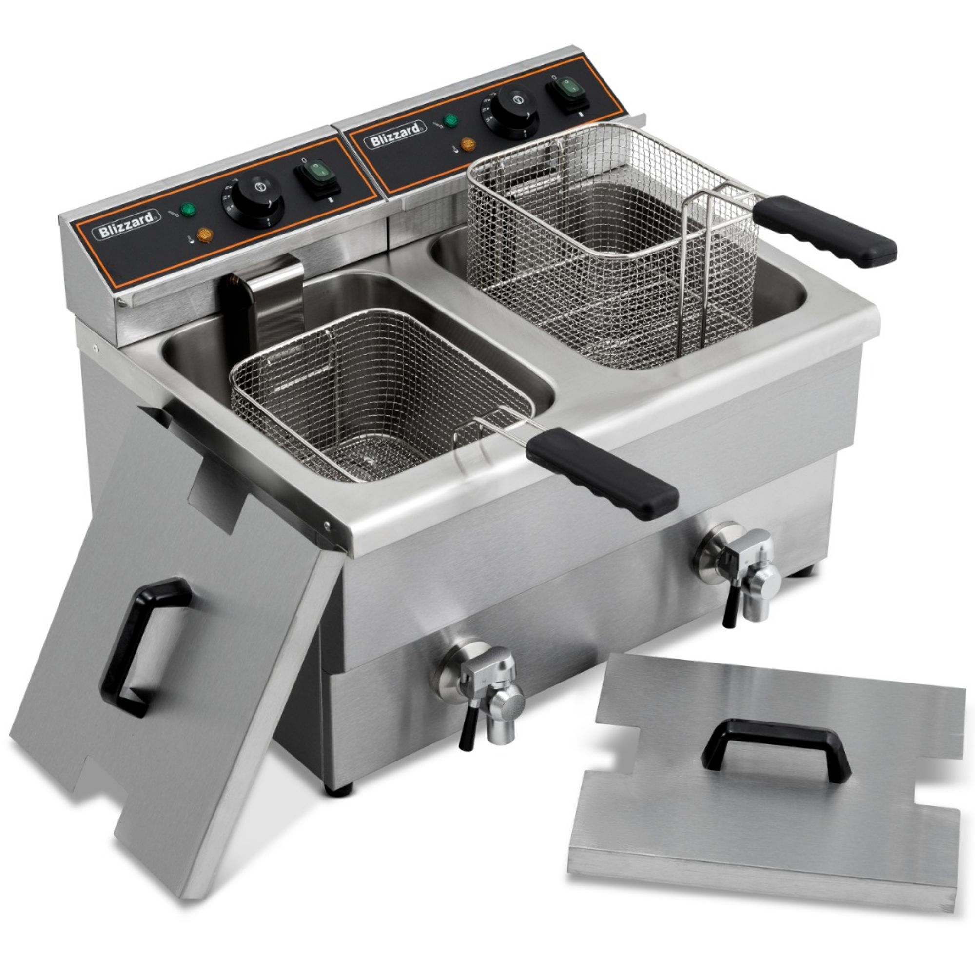 • Check iconStainless steel construction 2x 8L tanks Mesh batter plate Easy-to-use controls LED indication lights Lids and baskets supplied Basket dimensions 230 x 190 x 140mm deep Safety cut out Drain tap Rubber feet On/off switch Brand: BLIZZARD Size (H x W x D): 405 x 580 x 470 Weight: 19.0 Finish: Stainless Steel Controller: Manual thermostat Temp Range: +50C/+190C Power Consumption (W): 6000W Gross Capacity: 2 x 8 ltr