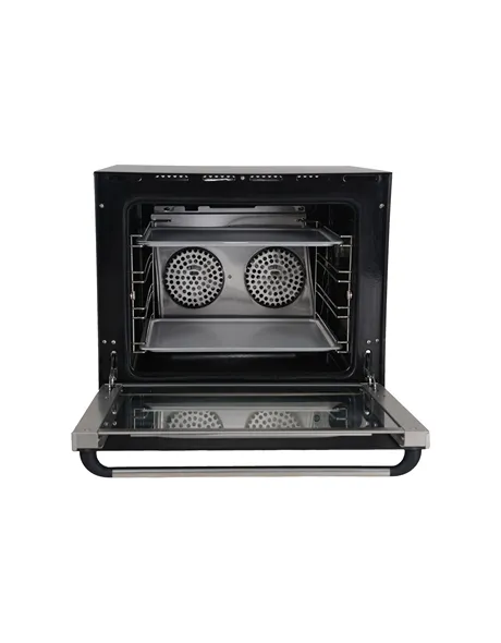 The Blizzard BCO1 convection oven is designed with a stainless steel exterior, making it a convenient countertop appliance. It is ideal for baking, cooking, reheating, and warming, featuring twin fan motors for consistent temperature control. This electric oven has a 33-litre capacity and includes internal illumination. It is equipped with a removable double-glazed door and removable racks, ensuring easy cleaning. The oven is supplied with four trays, each measuring 315 x 440mm.