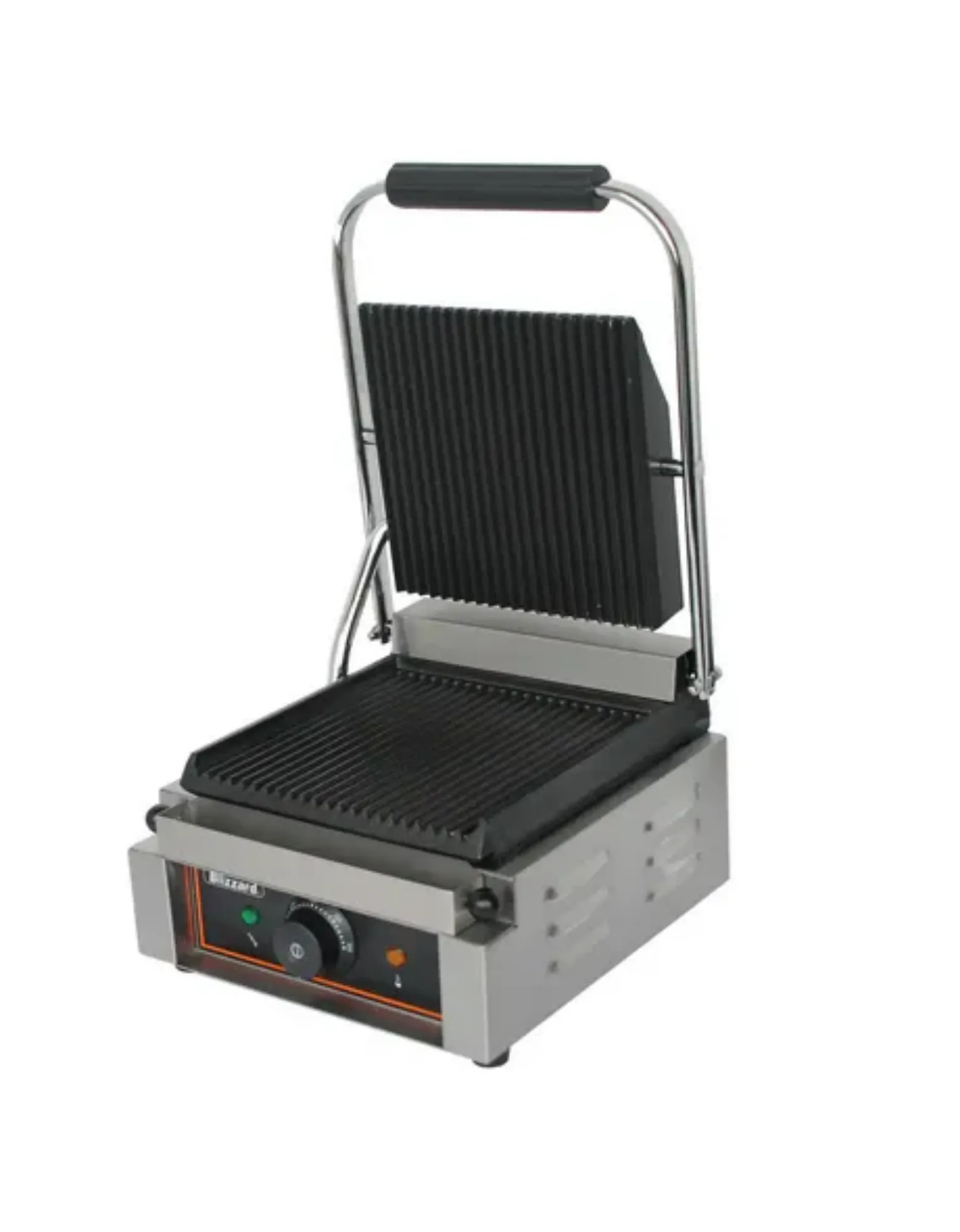 The 1800W Single Contact Grill features both top and bottom ribbed plates, providing efficient and even grilling. This powerful appliance is designed to deliver high-performance cooking, making it ideal for preparing a variety of grilled dishes. Its robust construction ensures durability, while the ribbed design enhances the grilling process by creating those classic grill marks on your food. Perfect for both home and professional use, this grill is a versatile addition to any kitchen.