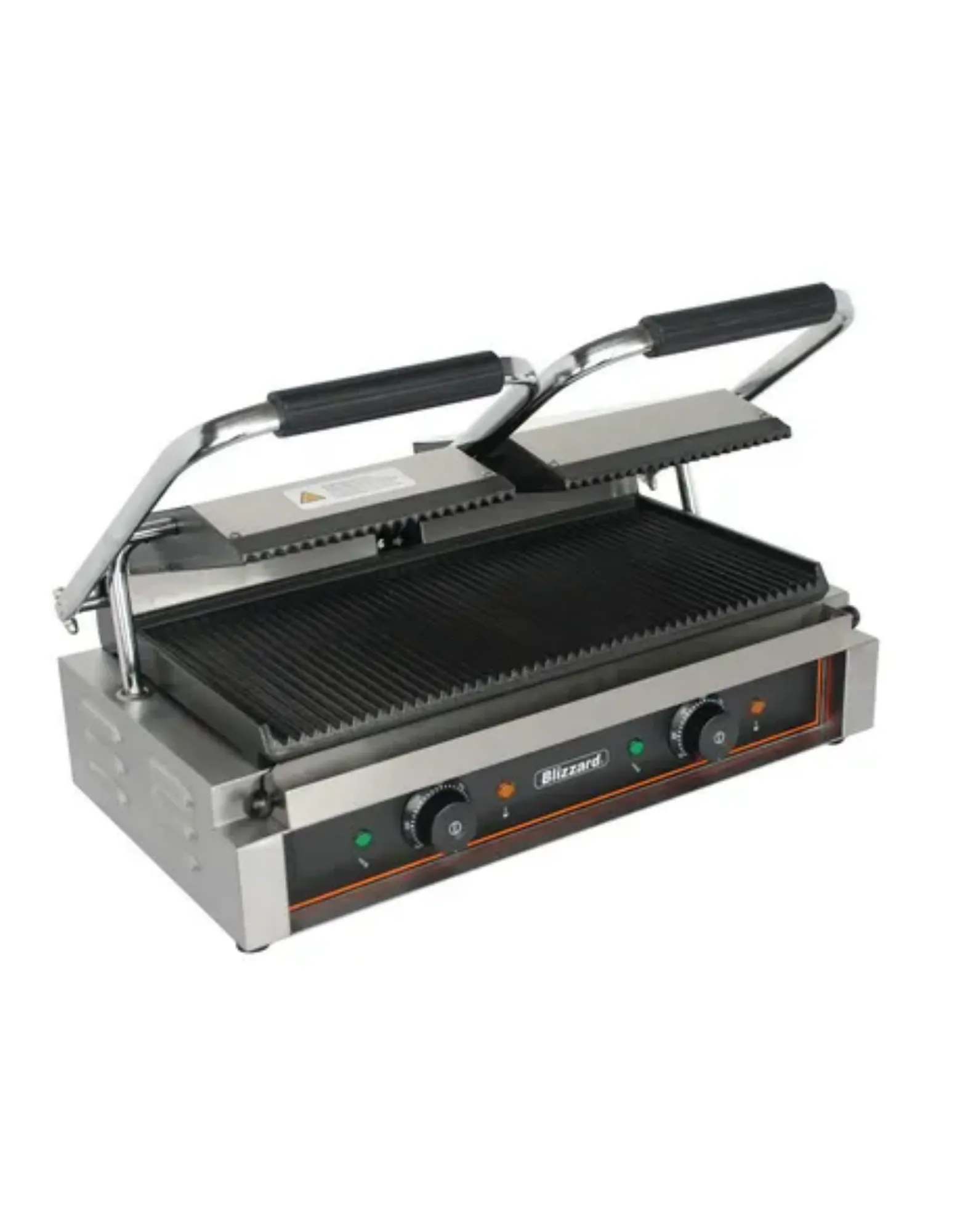 The 3600W Double Contact Grill features both top and bottom ribbed plates, providing efficient and even grilling. This powerful appliance is designed for professional use, ensuring high performance and durability. Its ribbed surfaces are ideal for creating perfectly grilled sandwiches, meats, and vegetables, offering versatility in cooking. The grill's robust construction and high wattage make it suitable for busy kitchens, delivering consistent results with every use.