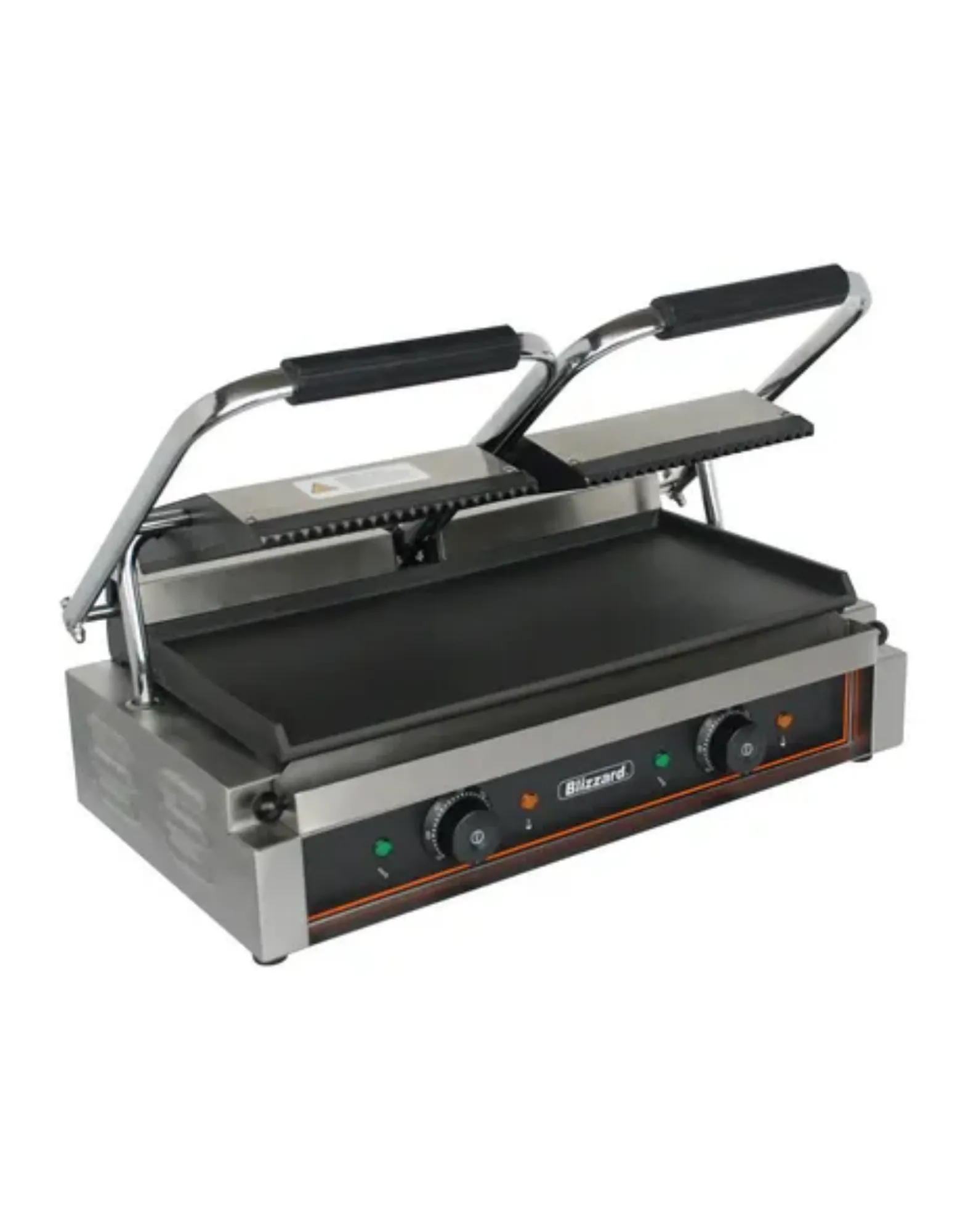 The 3600W Double Contact Grill features a smooth bottom surface, providing an efficient and versatile cooking experience. Designed for professional use, this grill is ideal for preparing a variety of dishes with precision and ease. Its powerful 3600-watt heating element ensures quick and even cooking, making it a valuable addition to any kitchen. The smooth bottom surface allows for easy cleaning and maintenance, ensuring long-lasting performance and reliability. Whether you're grilling sandwiches, meats, or vegetables, this double contact grill delivers consistent results every time.