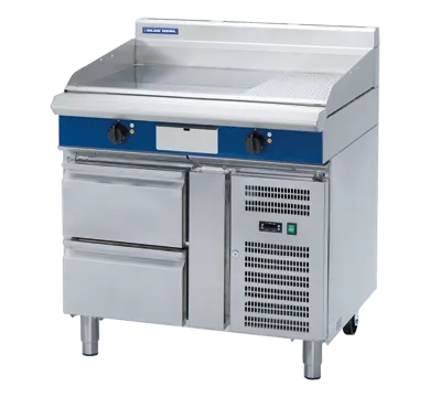 The Blue Seal EP516-RB 900mm electric griddle offers compact, yet powerful and reliable performance, thanks to its 1/3rd ribbed griddle. With a robust 12kW thermostatic element controlled by heavy-duty dial controls, the Blue Seal can easily handle busy breakfast, lunch, and dinner services. It remains easy to operate and simple to clean, making it an ideal choice for high-demand environments. The sturdy stainless steel stand includes a convenient undershelf for additional storage and rear castors for enhanced manoeuvrability.