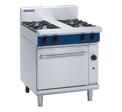 The cooktop range features four burners, each with a 28MJ/hr capacity, and a 1/1 GN gas static oven. It is designed with heavy-duty stainless steel for a robust finish and includes flame failure protection on all burners for enhanced safety. The removable heavy-duty cast iron burners and vitreous enamel pot stands ensure durability and ease of maintenance.