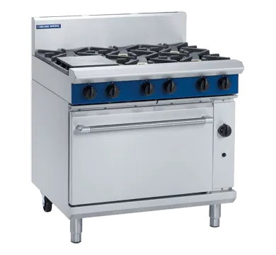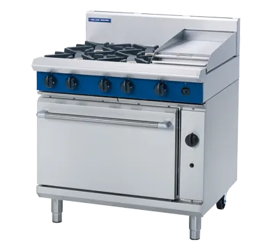 The product features open burners with a heavy-duty stainless steel finish, ensuring durability and a sleek appearance. Each burner is equipped with flame failure protection for enhanced safety. The removable heavy-duty cast iron burners and vitreous enamel pot stands provide both robustness and ease of cleaning. The design includes heavy-duty reinforced control knobs and a drop-down door with a welded frame for added strength.