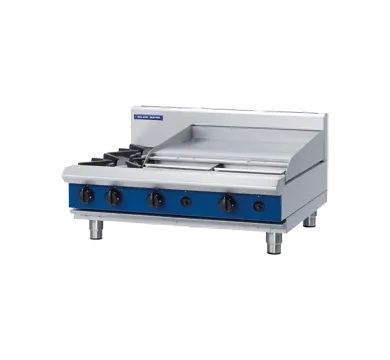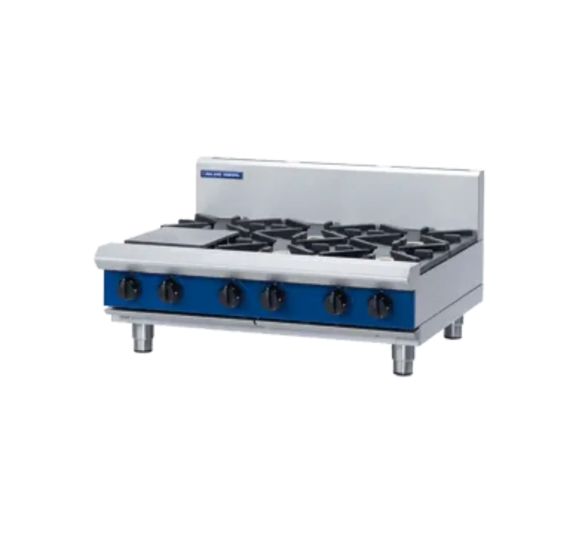 Blue Seal Evolution Series cooktops focus on functionality and performance. If you require substantial power, the open top burners on the gas option provide an impressive 28MJ of heat. The cooktops feature a more uniform surface, achieved through thicker, heavy-duty vitreous enamel trivets with extended finger supports. This design allows you to slide smaller pots and pans around the cooktop without the risk of tipping over.
