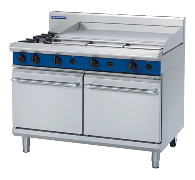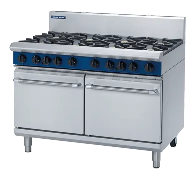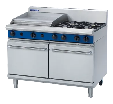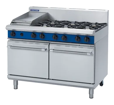 The product features a heavy-duty stainless steel finish, ensuring durability and a sleek appearance. It includes flame failure protection on all burners for enhanced safety. The removable heavy-duty cast iron burners and vitreous enamel pot stands provide robust support and easy maintenance. The control knobs are reinforced for durability, and the drop-down door features a welded frame for added strength. The oven liner is fully welded and vitreous enamelled, contributing to its longevity and ease of cleaning.