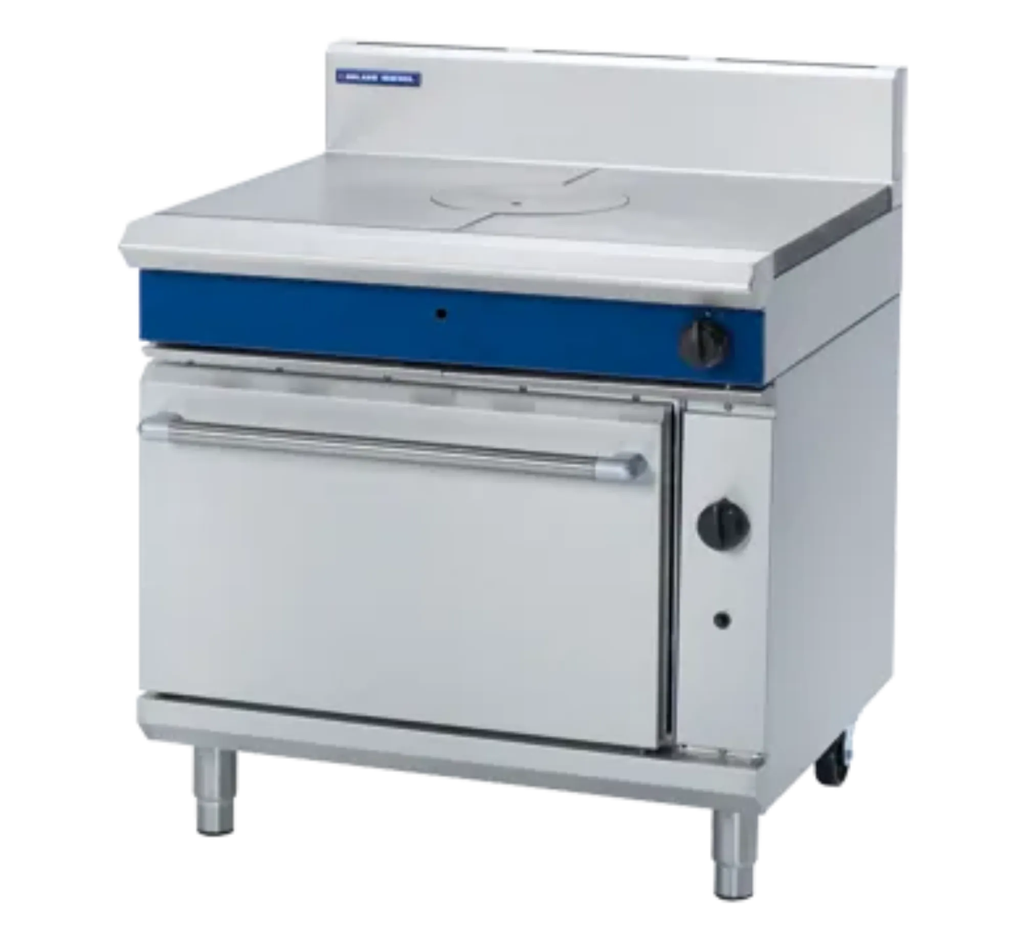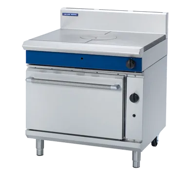The stainless steel Blue Seal solid top gas oven range G570, featuring a 2/1 gastronorm gas oven and a two-stage target top burner, offers accurate temperature control and versatility. The oven is equipped with two racks and four rack positions, along with a full-width drop-down door for ease of use. The stainless steel finish and removable center ring ensure the range is easy to maintain and clean.