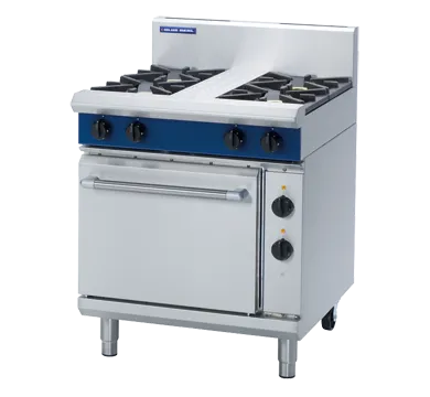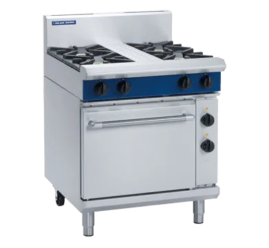 The cooktop range features four burners with a 1/1 GN electric static oven, each burner providing 28MJ/hr of power. It is designed with a heavy-duty stainless steel finish and includes flame failure protection on all burners for enhanced safety. The unit is equipped with removable heavy-duty cast iron burners and vitreous enamel pot stands, ensuring durability and ease of maintenance.
