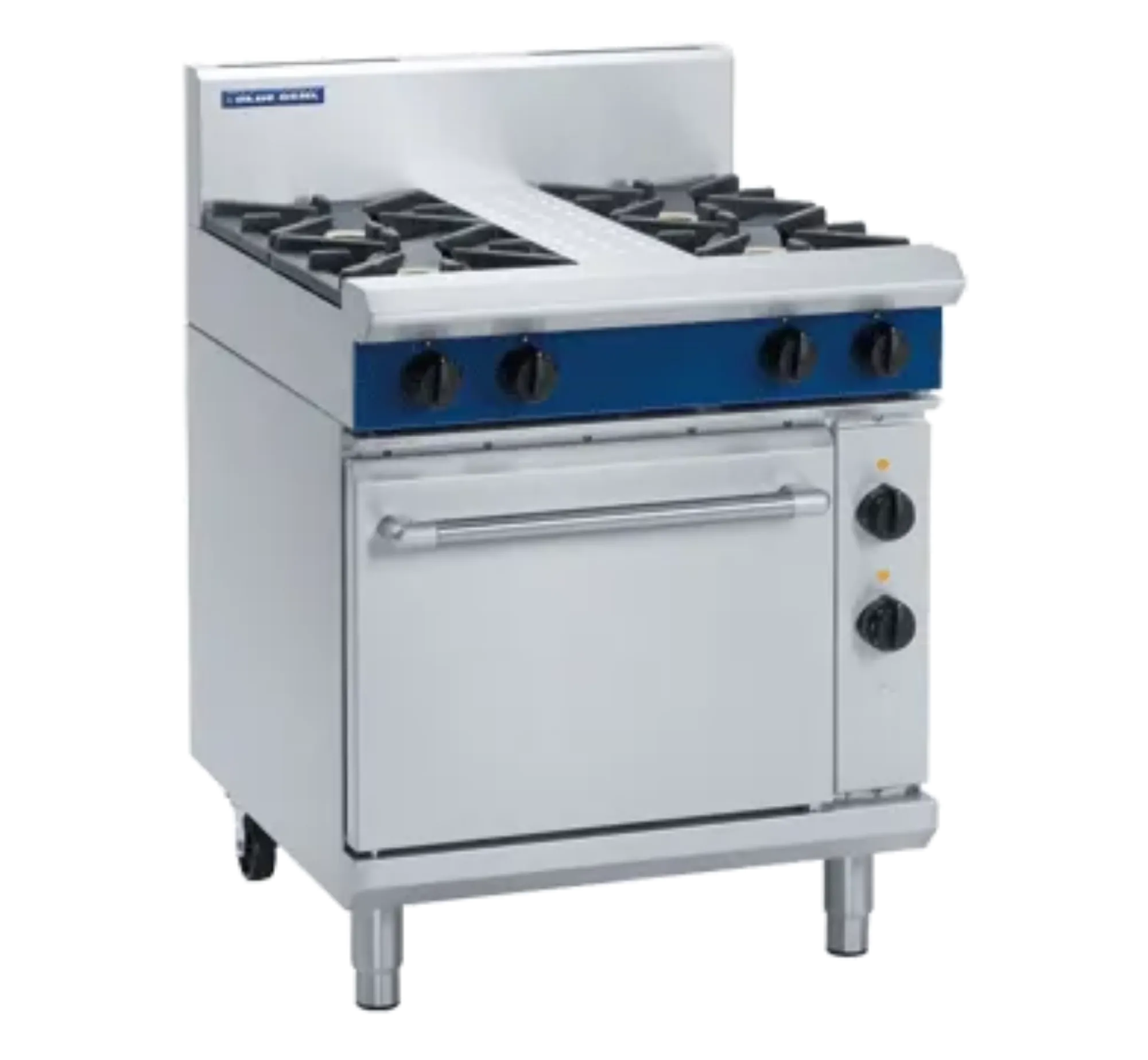 The control knobs are heavy-duty and reinforced for longevity. The oven door is a drop-down style with a welded frame, and the oven liner is fully welded and vitreous enamelled for easy cleaning. The cool touch stainless steel door handle ensures safe operation, while the adjustable feet and two additional rollers provide stability and mobility. This cooktop range is designed for easy cleaning, installation, and service, making it a practical choice for any kitchen.