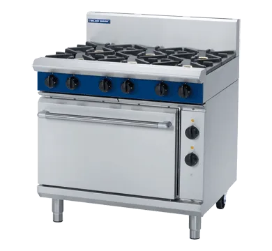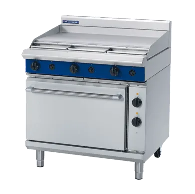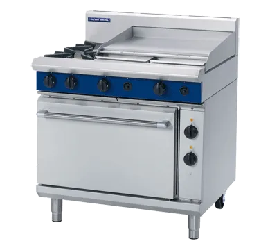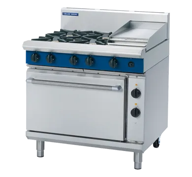 The oven liner is fully welded and vitreous enamelled, providing a robust and easy-to-clean interior. The cool touch stainless steel door handle ensures safe and comfortable operation. The appliance is equipped with adjustable feet and two additional rollers, facilitating easy installation and movement. Overall, the design prioritizes easy cleaning, installation, and serviceability.