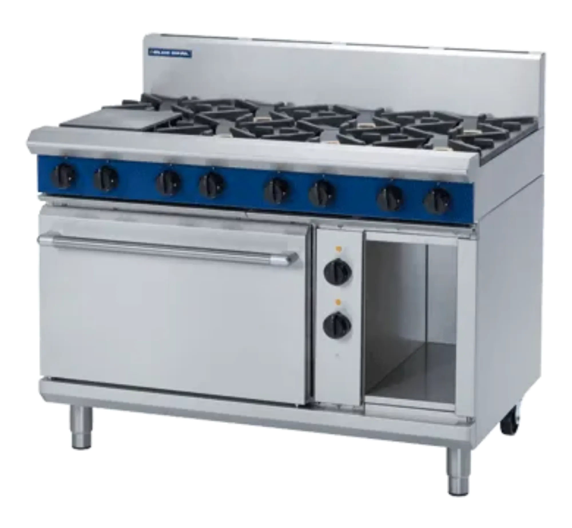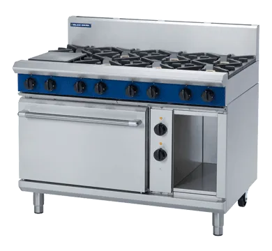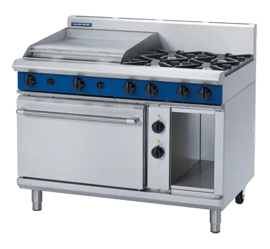 The storage cabinet is located on the right-hand side and features a heavy-duty stainless steel finish. It includes flame failure protection on all burners for enhanced safety. The cabinet is equipped with removable heavy-duty cast iron burners and vitreous enamel pot stands, ensuring durability and ease of maintenance. The heavy-duty reinforced control knobs provide reliable operation.