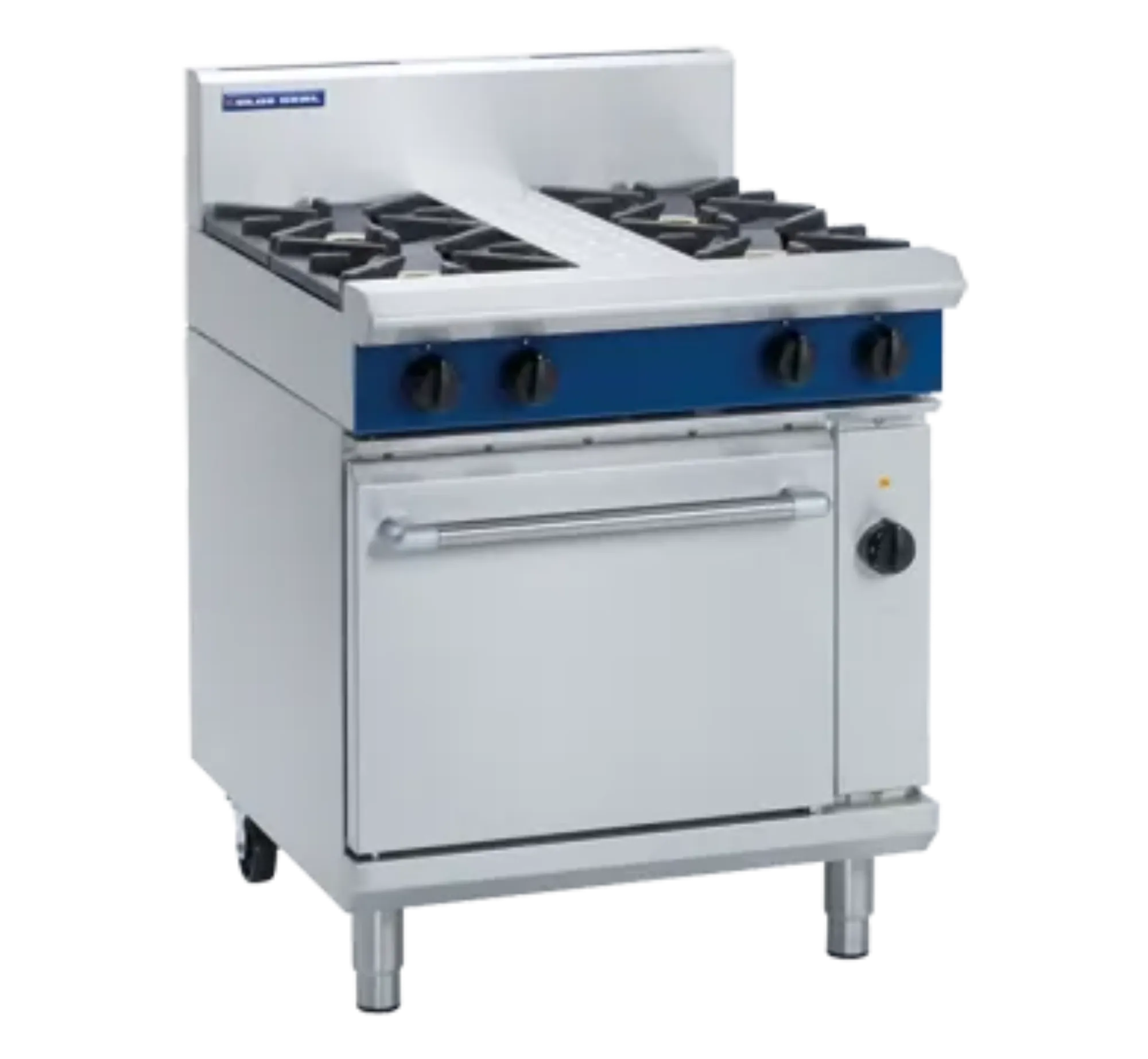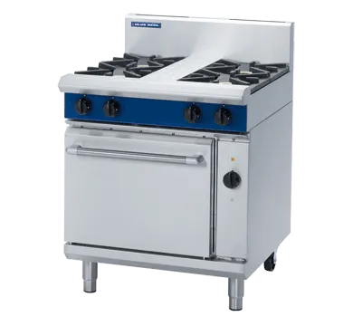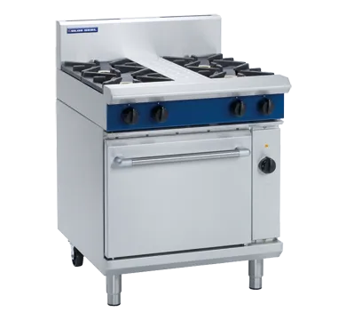 The cooktop range features four burners and a 1/1 GN electric static oven, with each burner offering a powerful 28MJ/hr output. Constructed with a heavy-duty stainless steel finish, this range ensures durability and longevity. Safety is prioritized with flame failure protection on all burners. The design includes removable heavy-duty cast iron burners and vitreous enamel pot stands for ease of maintenance.