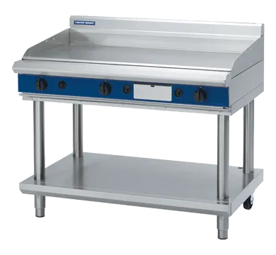 The Blue Seal GP518-LS/N 1200mm natural gas chrome griddle offers compact, yet powerful and reliable performance, making it perfect for the busy professional kitchen. Equipped with a robust 31kW thermostatic burner system, it is controlled by heavy-duty dial controls, allowing the Blue Seal to easily handle busy breakfast, lunch, and dinner services. Despite its powerful capabilities, it remains easy to operate and simple to clean. The griddle features a sturdy stainless steel stand with a convenient undershelf for additional storage and rear castors for enhanced manoeuvrability.